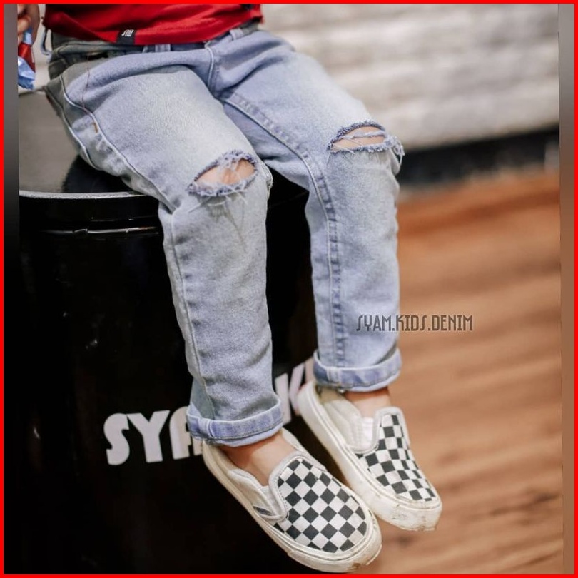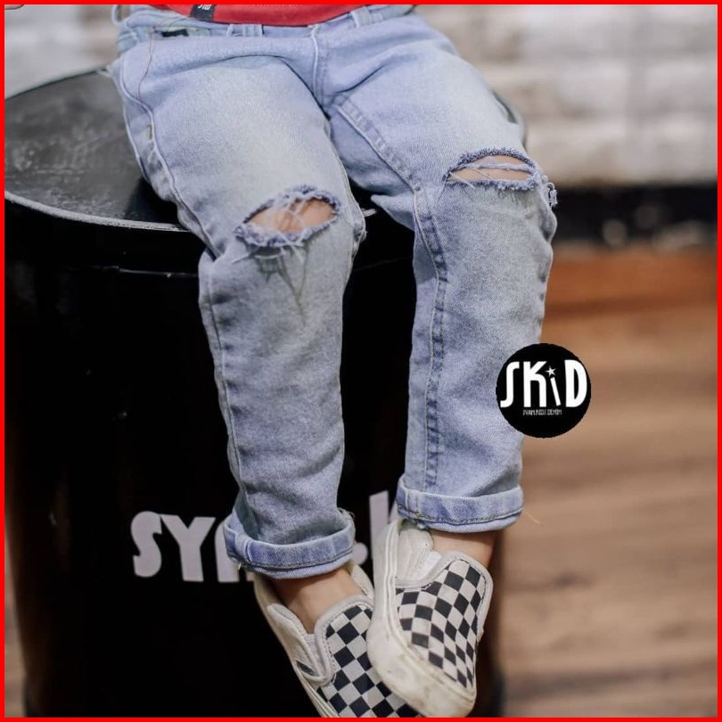 Celana Jeans Anak Blue Sky Biru Langit Washed Spray Ripped Sobek Lutut Ukuran 6 Bulan Sampai 13 Tahun