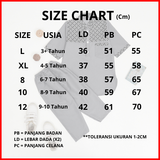 SIZE M (1-2 TAHUN), SIZE (3+ TAHUN), SIZE XL (4-5 TAHUN), SIZE 8 (6-7 TAHUN), SIZE 10 (8 TAHUN), SIZE 12 (9-10 TAHUN)