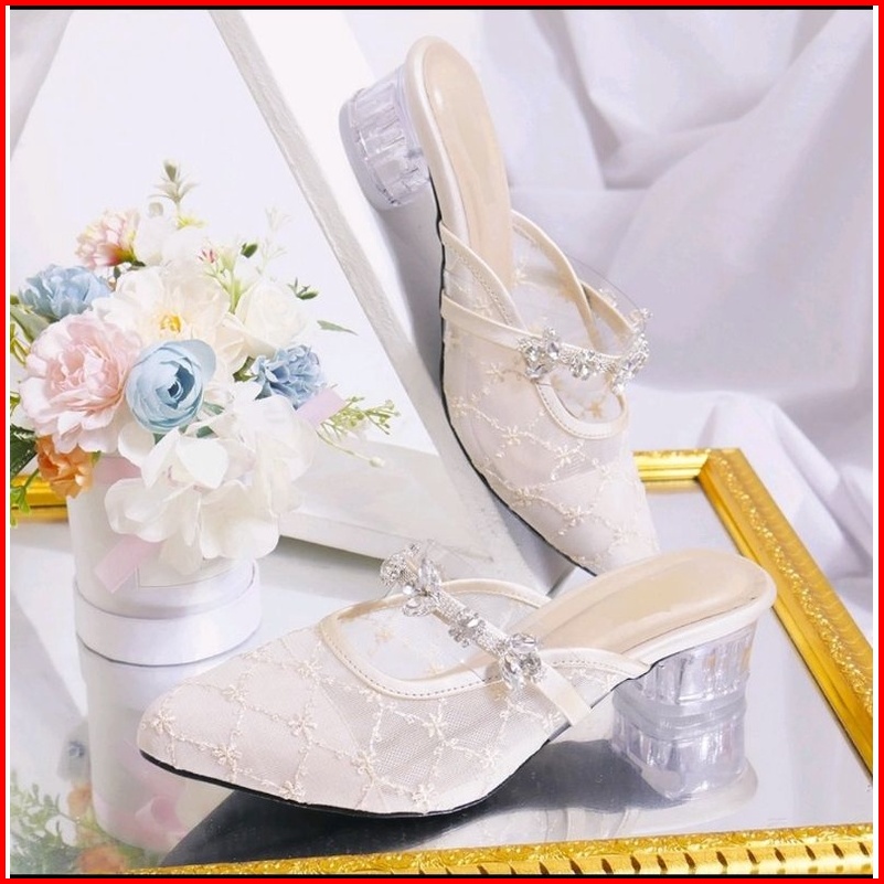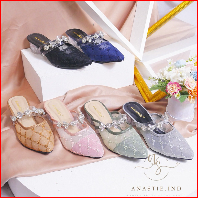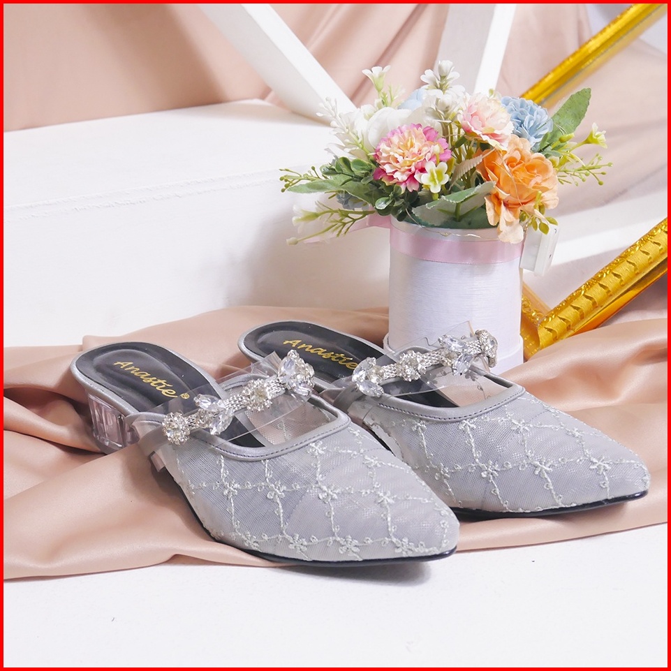 Anastie Amelia - Sendal Wanita Sendal Pesta Heels Hak Kaca 3cm Mutiara Brukat Sendal Wanita Kekinian