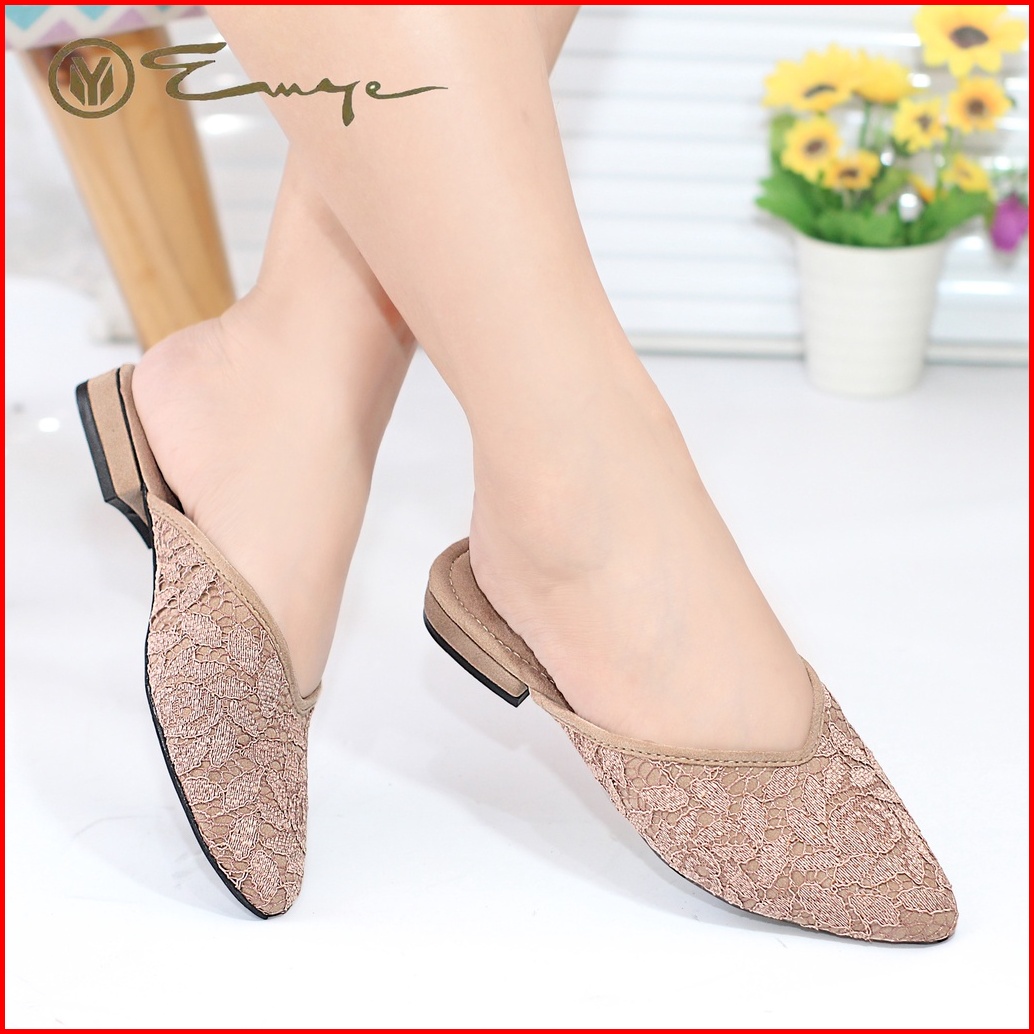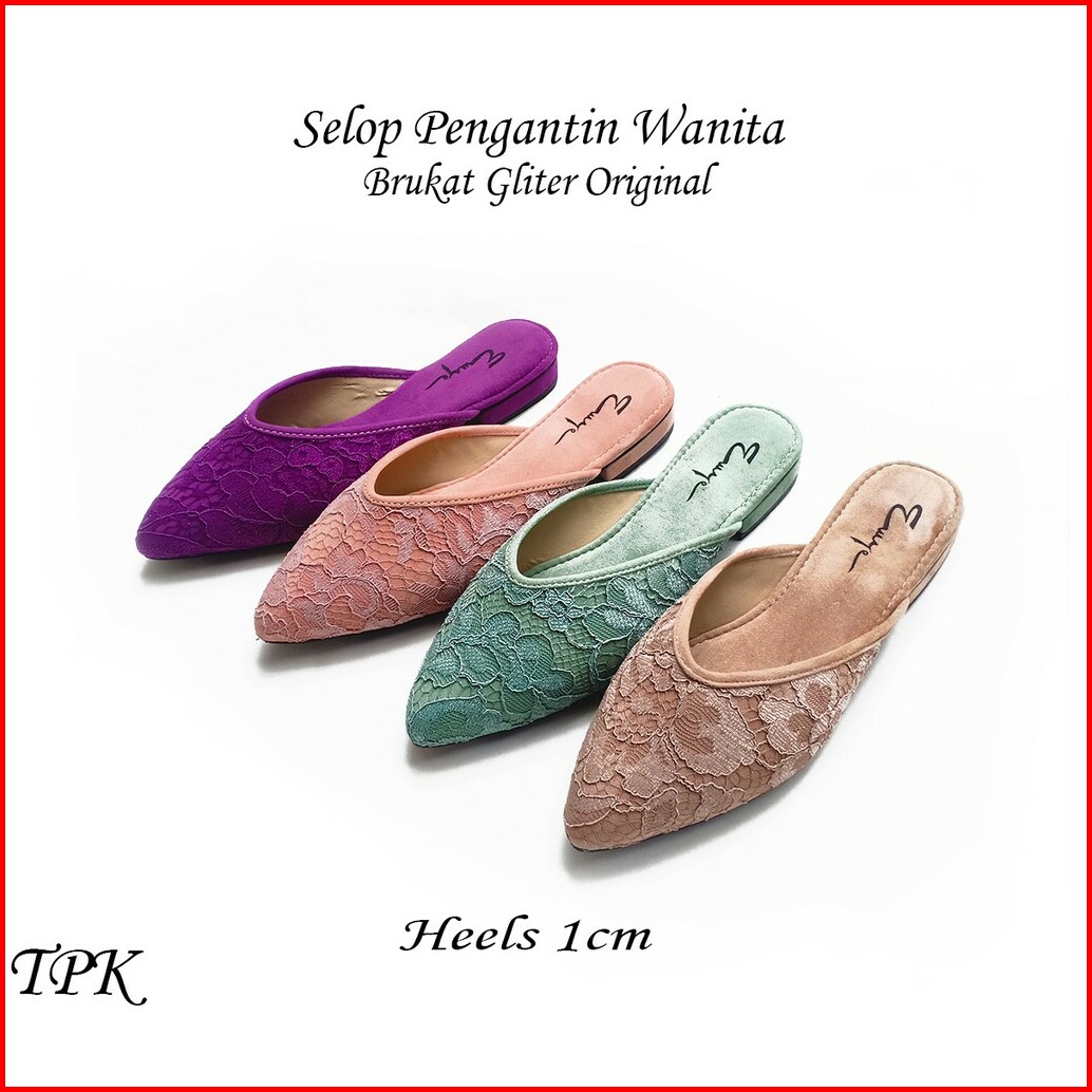 Emye - Sandal Selop Pengantin Wanita Brukat Glitter Flat Shoes Sendal Kondangan Pengantin Wisuda