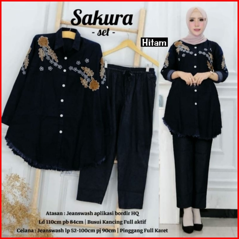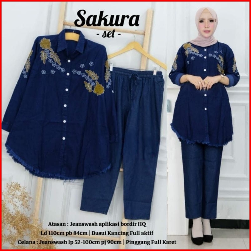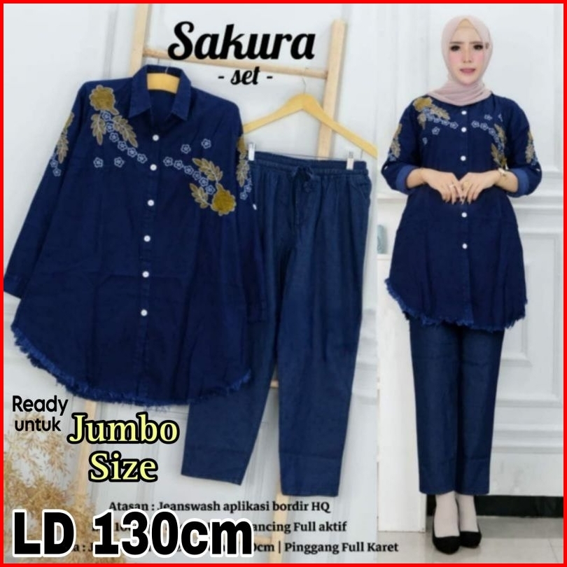 Setelan Wanita Jeans Ada Juga Jumbo Pakaian Denim One Set Premium Bordir Bunga Perempuan Busui Hq