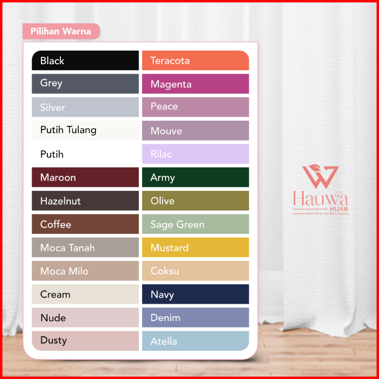 Burgundy, Moca Tanah, Moca Milo, Cream, Coksu, Nude, Dusty Pink, Hitam, Abu Grey, Abu Silver, Hazelnut, Coffe, Mouve, Maroon, Navy, Denim, Stella, Army, Olive, Sage Green, Putih Bersih