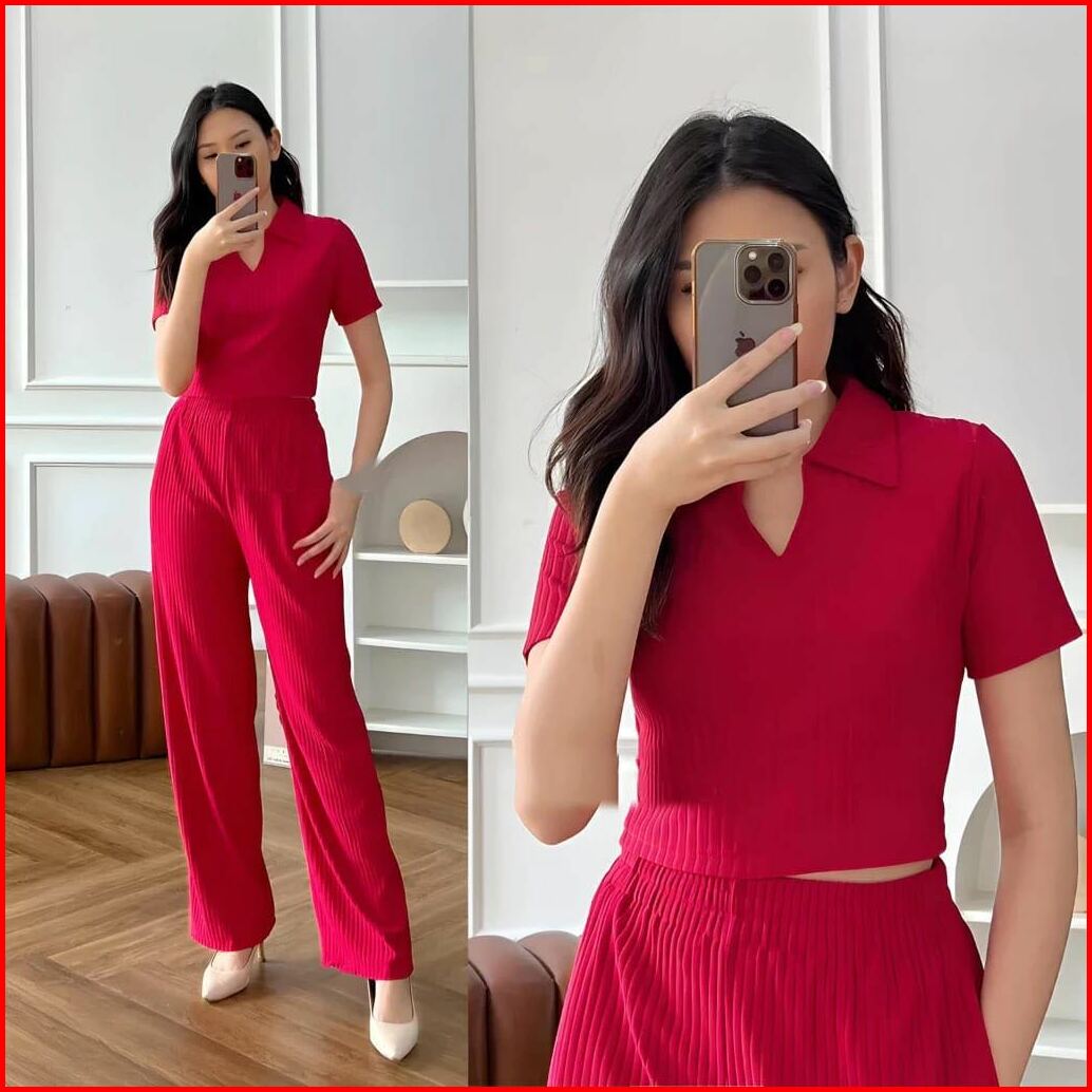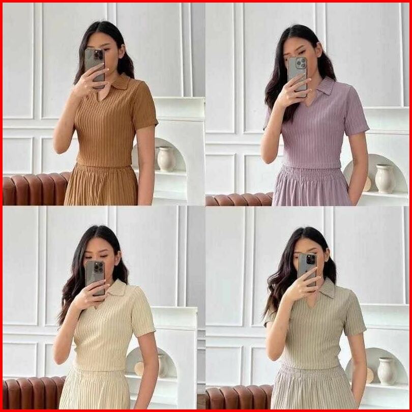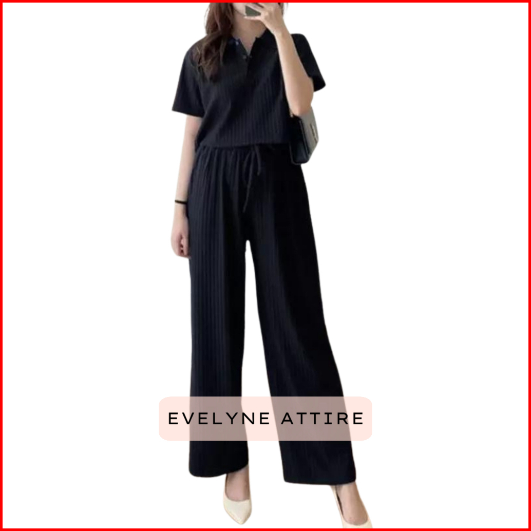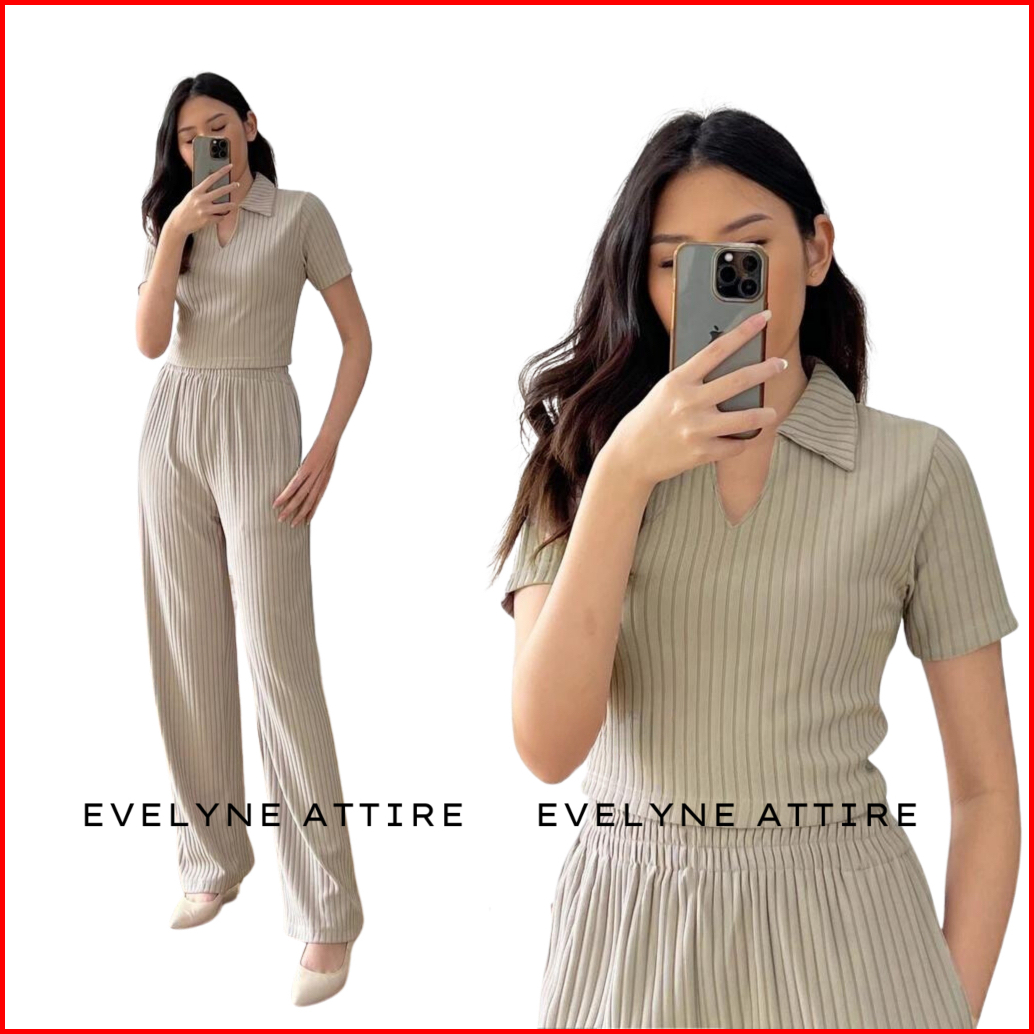 Evelyne - Oneset Knit Polo Celana Panjang Set Rib Knit Premium Setelan Knit Hornet Wanita Atasan Crop Polo Top Kekinian