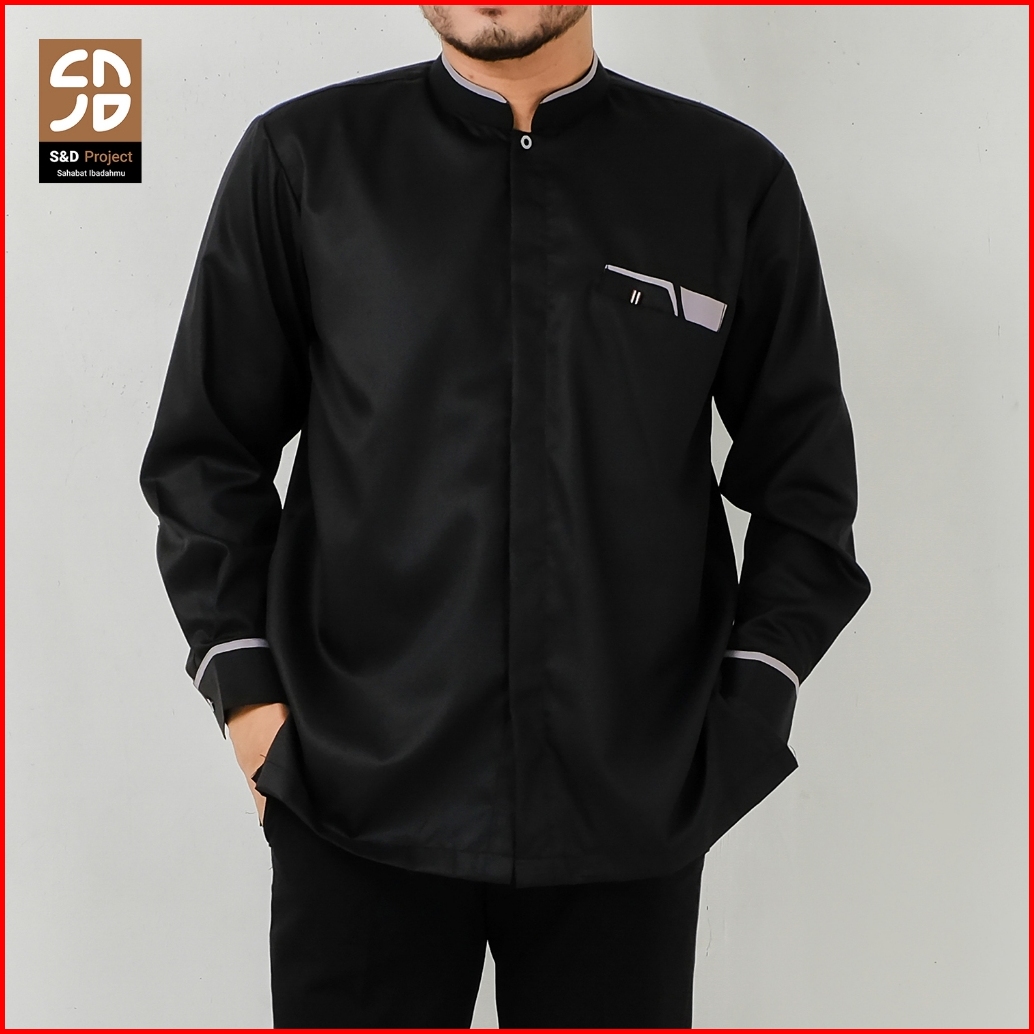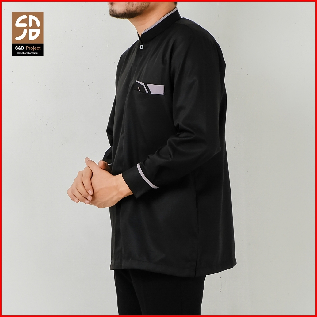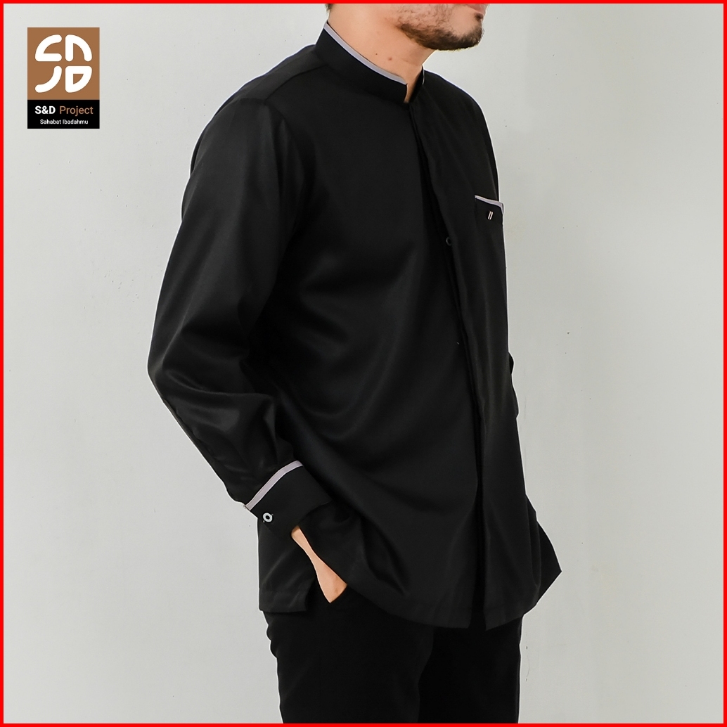 S D Project Baju Koko Katun Toyobo Polos Lengan Panjang Kerah Mandarin Bersaku Ukuran M L Xl - Warna Hitam