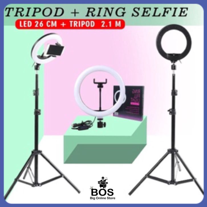 BOS - Paket Tri Live Streaming 2.1 Meter Plus Selfie Ring Light Lampu LED 26cm / 33cm | Ringlight 45cm