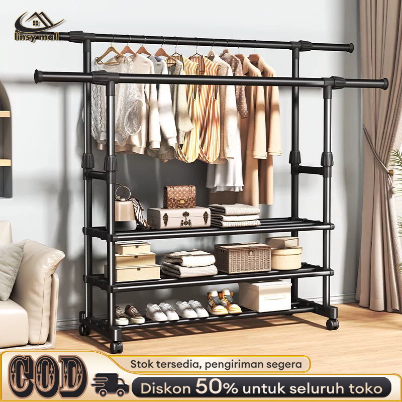 Stand Hanger Double Rak Gantungan Baju Serbaguna Rak Baju Dengan 4 Roda 2 Sisi