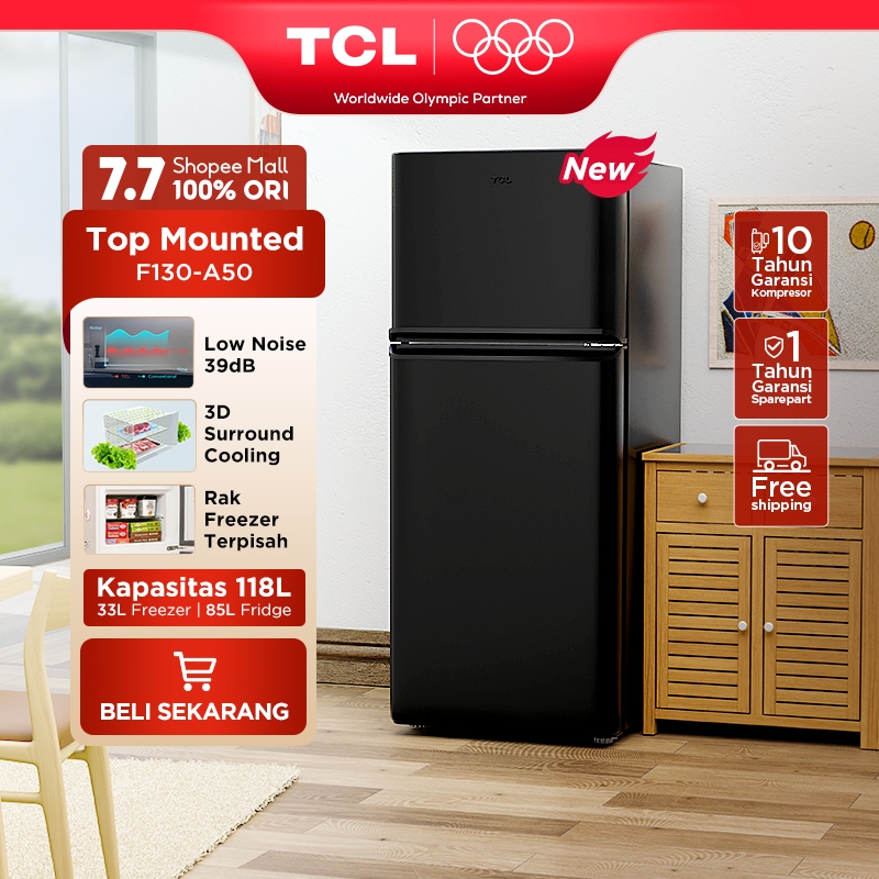 KULKAS 2 PINTU TCL F130-A50 KAPASITAS 118L RAK FREEZER TERPISAH 3D SURROUND COOLING ADJUSTABLE SHELVES LOW NOISE 39DB