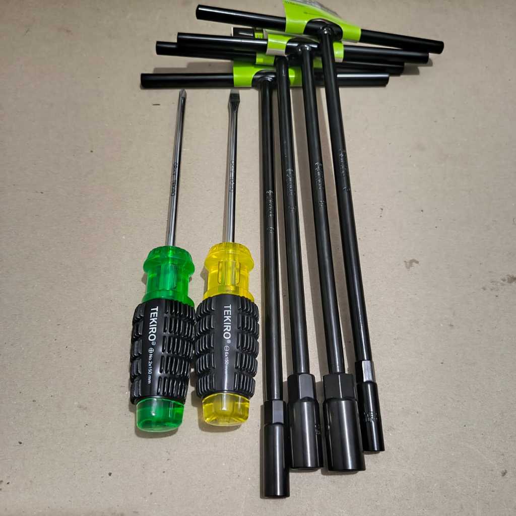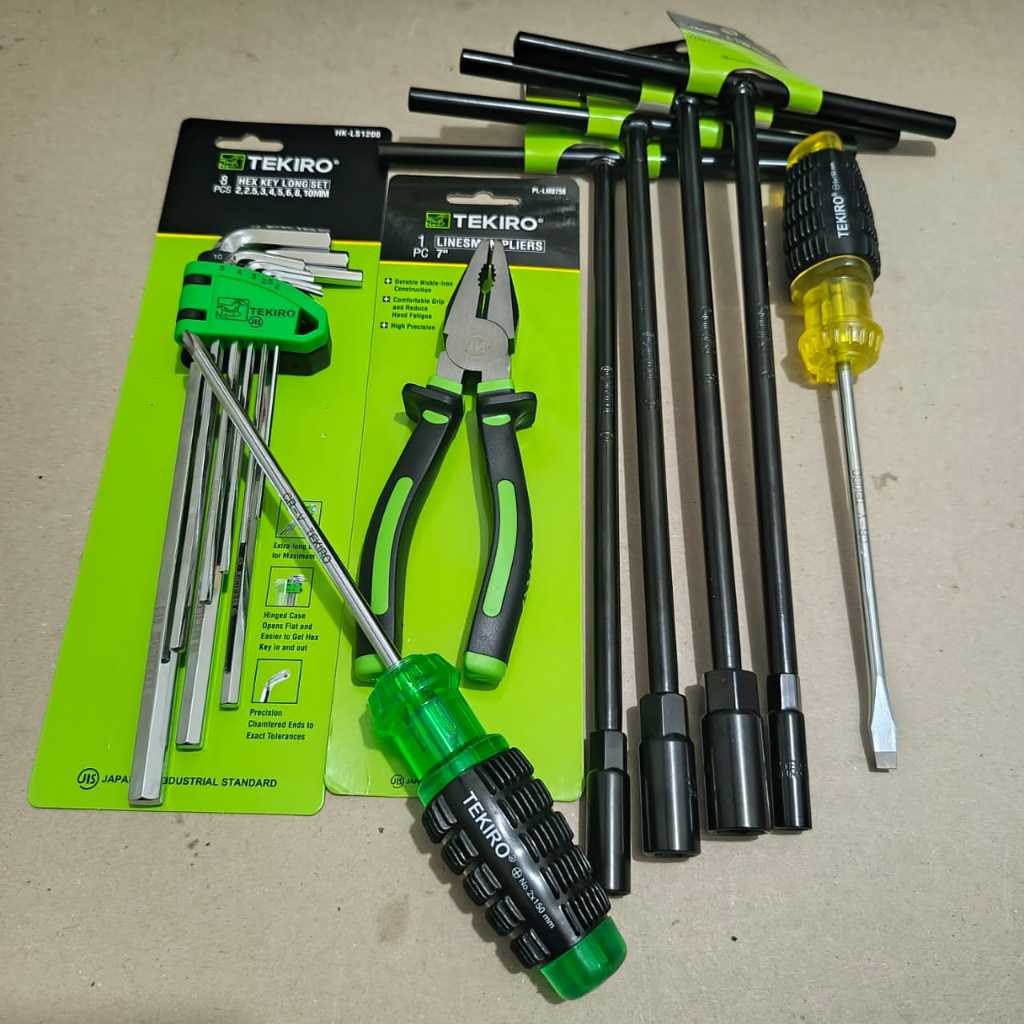 Tekiro Paket Lengkap 1 Set Kunci T 4pcs 8-10-12-14 mm + Kunci L Set 9 Pcs + Tang Kombinasi 7 inch + Obeng Gagang karet Plus ( + ) Minus ( - ) Hijau Kuning Panjang PH2