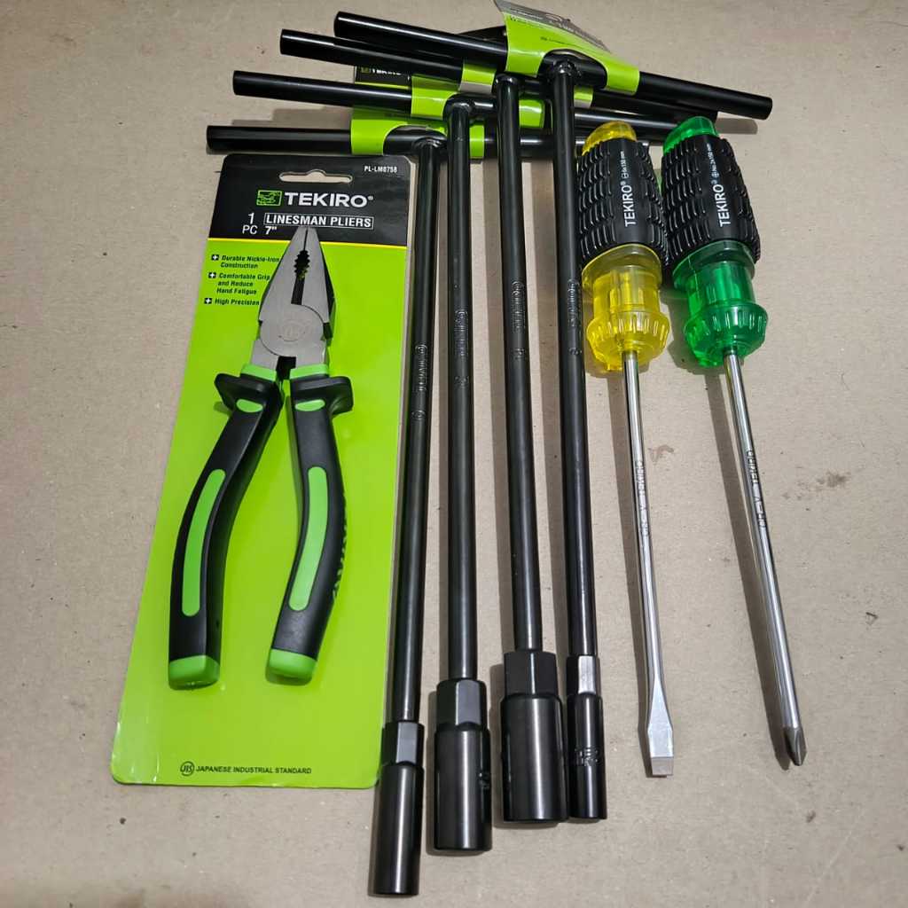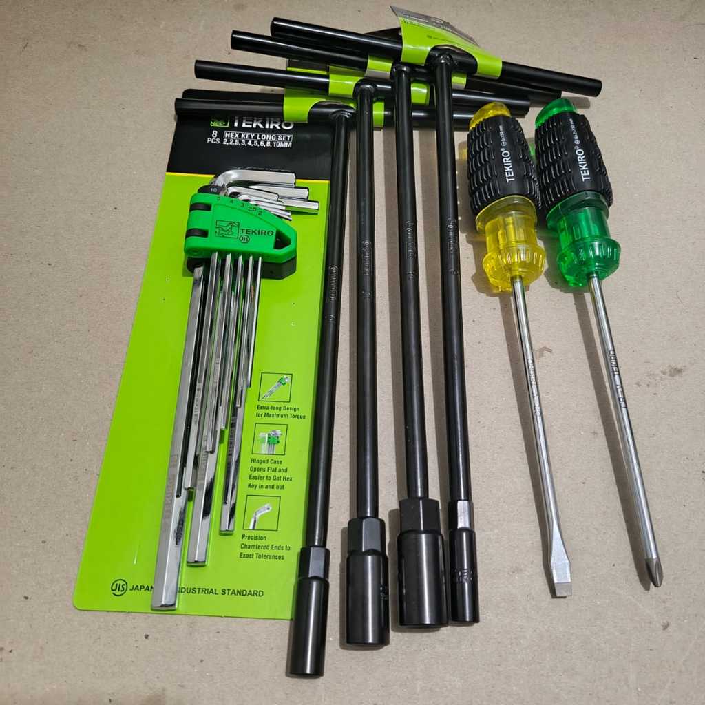 Tekiro Paket Lengkap 1 Set Kunci T 4pcs 8-10-12-14 mm + Kunci L Set 9 Pcs + Tang Kombinasi 7 inch + Obeng Gagang karet Plus ( + ) Minus ( - ) Hijau Kuning Panjang PH2