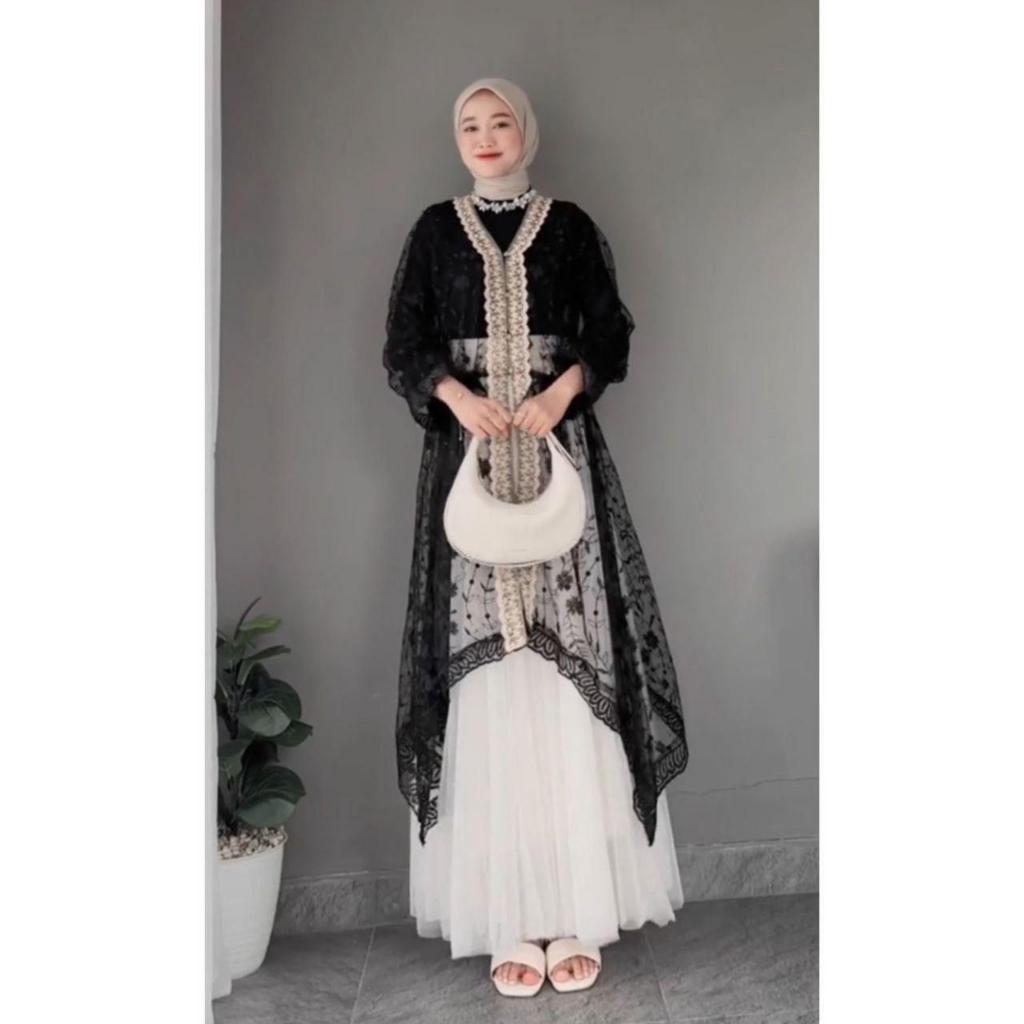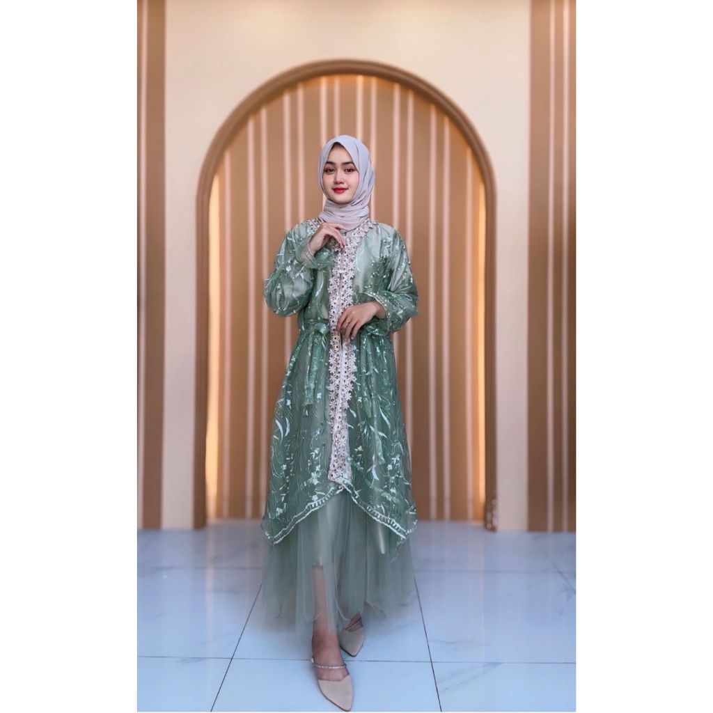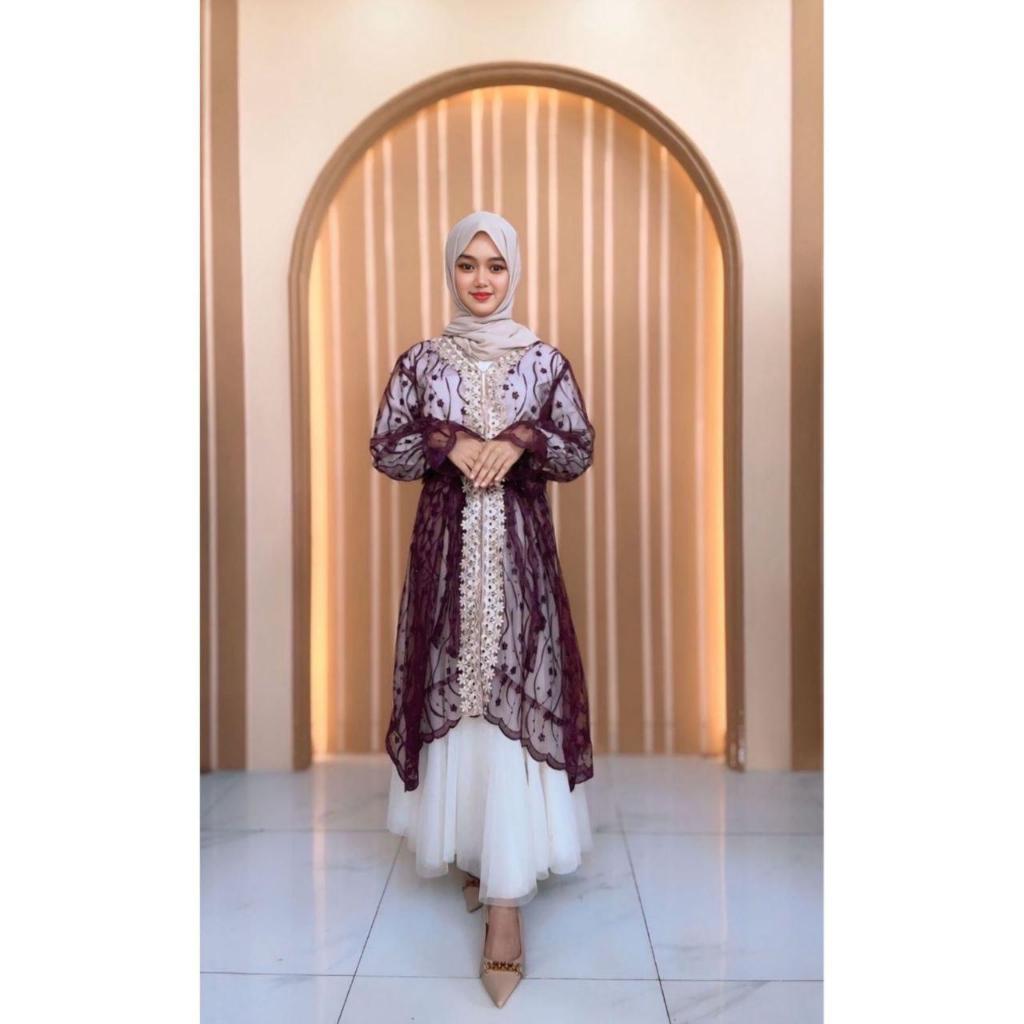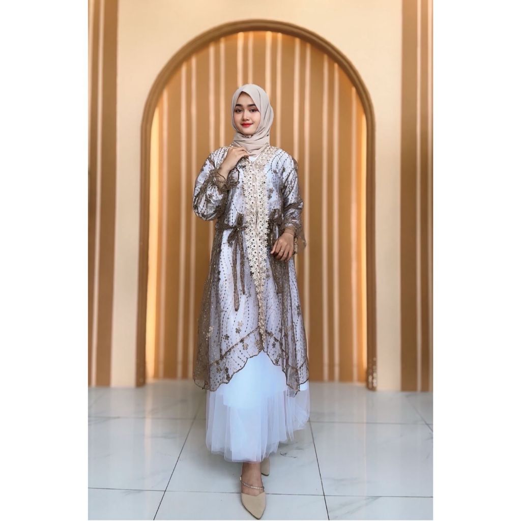 Raya Dress satu Set Inner Outer Dan Rok Tutu Camel Busana Gamis Muslim Wanita Pesta Kondangan