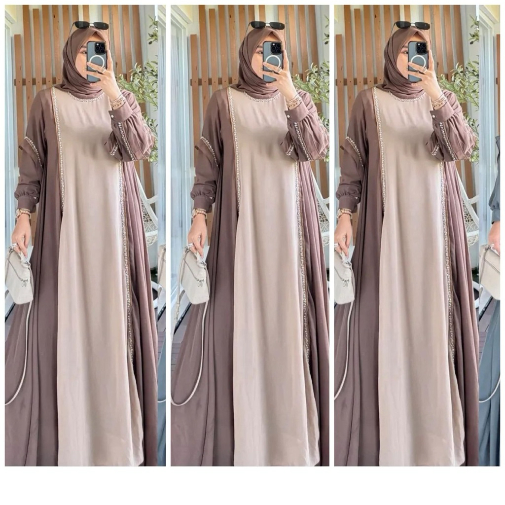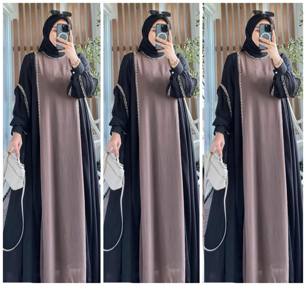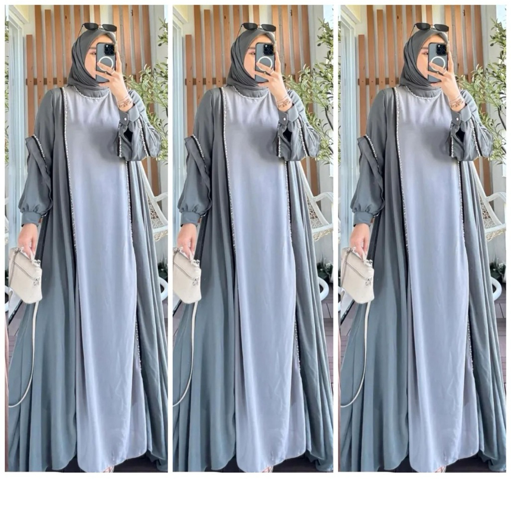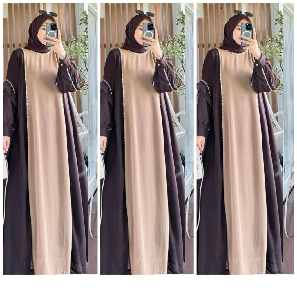Gamis Syar’i Ceruty baby Doll Mix Desain Payet Mutiara Terbaru Set Baju Muslim Plus Hijab Mewah Dan Elegan
