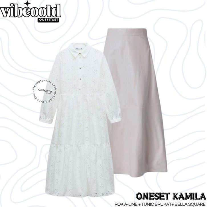 OUTFIT SET WANITA HIJAB ( BAWAHAN ROK A-LINE + ATASAN TUNIK BRUKAT PUTIH PANJANG LENGAN BALON + KERUDUNG BELLA SQUARE )