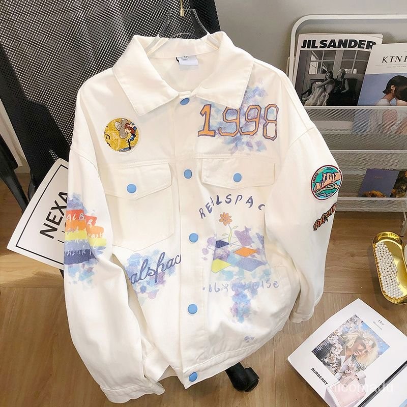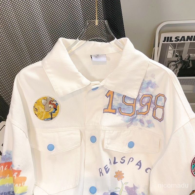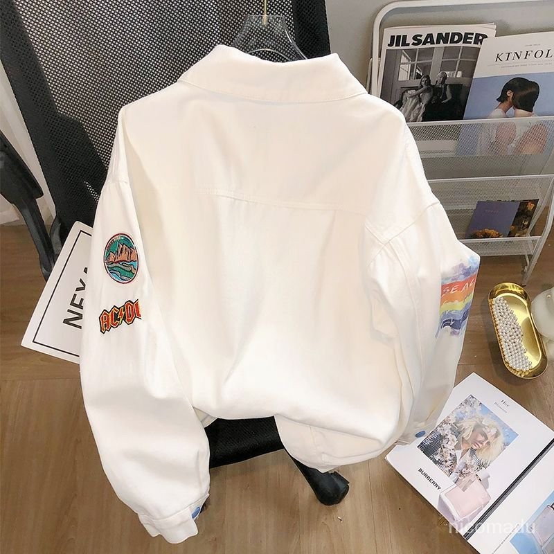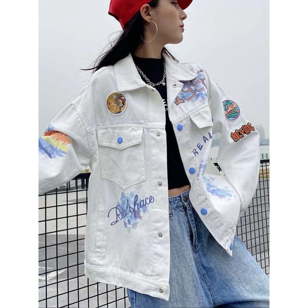 Jaket Jeans Oversize Putih Wanita /Jaket denim motif grafiti vintage wanita korean style