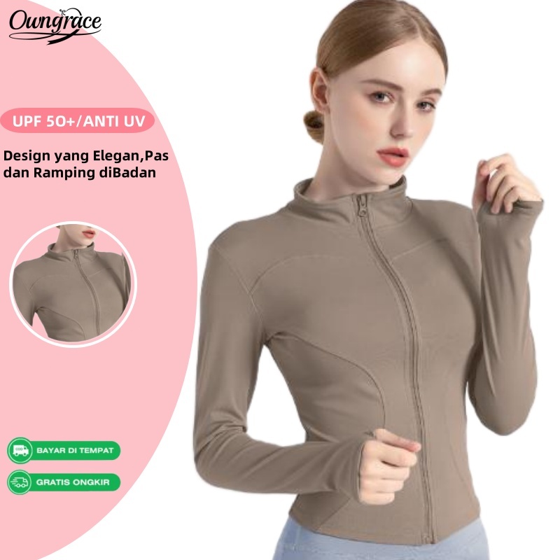 Owngrace Jaket fitnes gym wanita Polos Lengan Panjang cepat kering dengan resleting yoga /lari