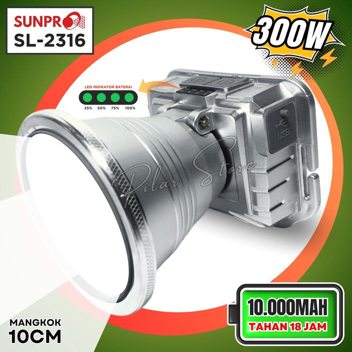 Senter Kepala Premium 300W 10.000mAh SUNPRO Cahaya Putih Tahan 18 Jam S-2316 / S-2315 PS