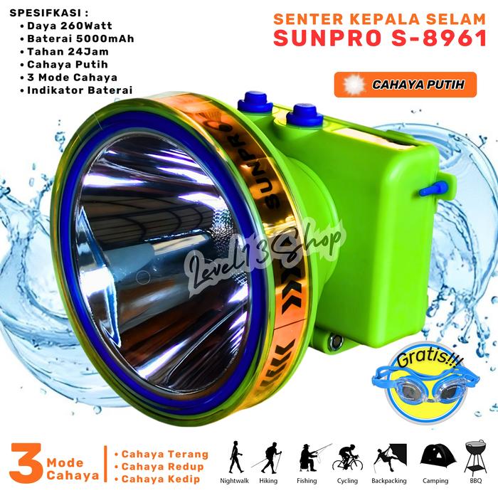 Senter Kepala Selam 260W Sunpro S-8961 Headlamp Diving Cahaya Putih Dan Kuning Super Terang Outdoor