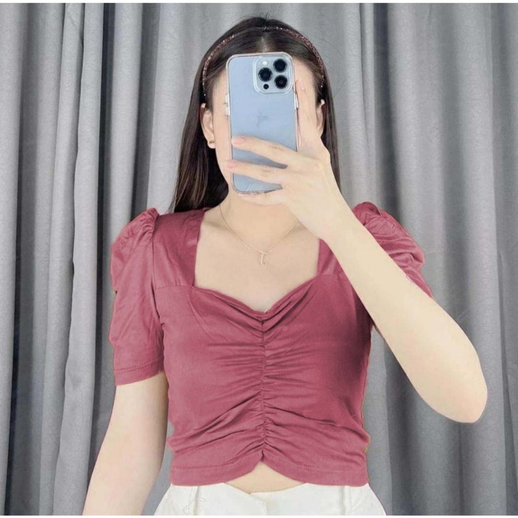 Crop Top Blouse Wanita Kerut Tengah Korea - Baju Crop Top Polos Wanita Spandek Import