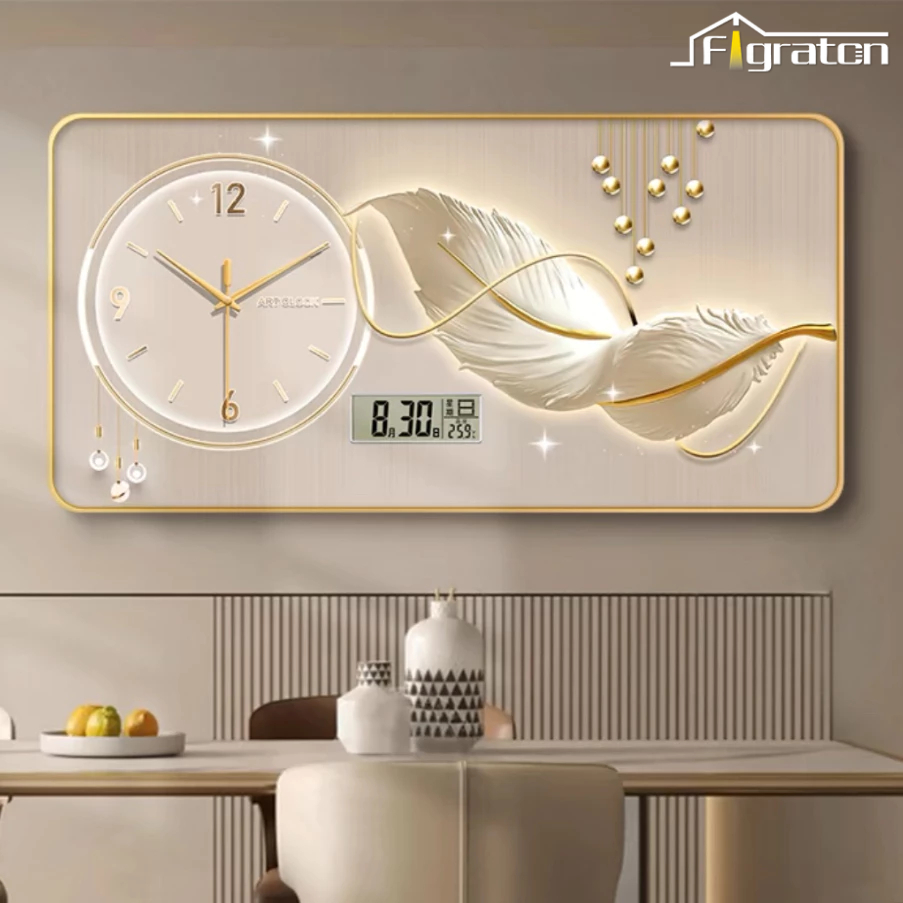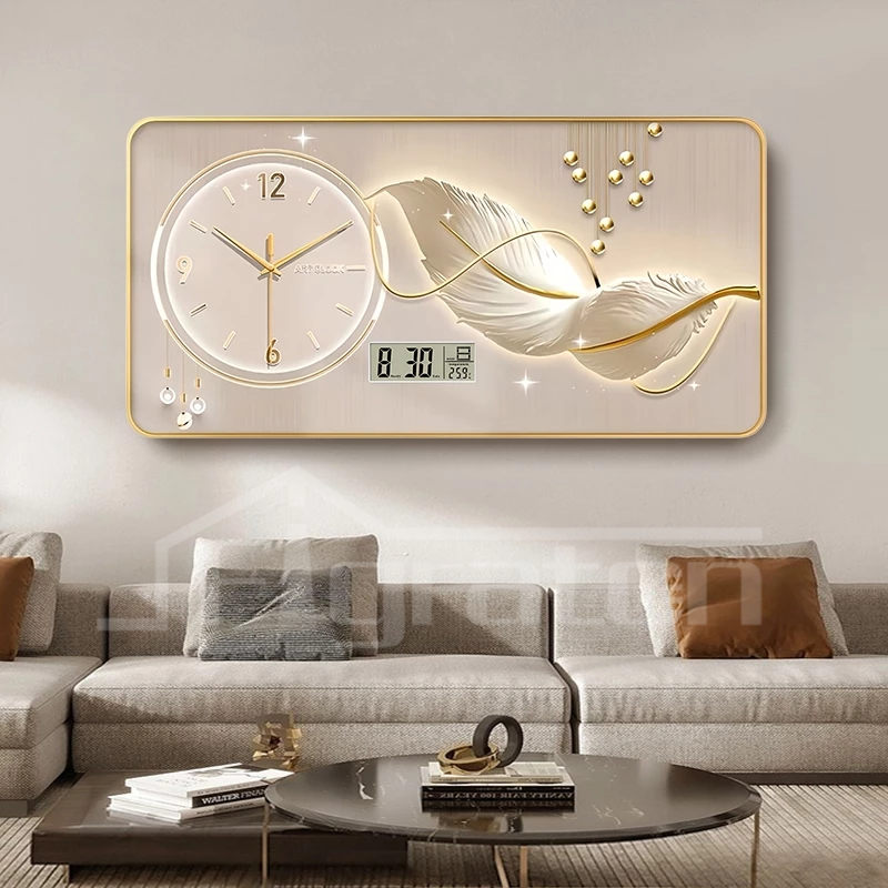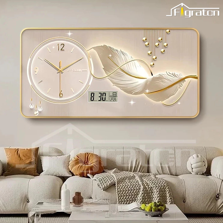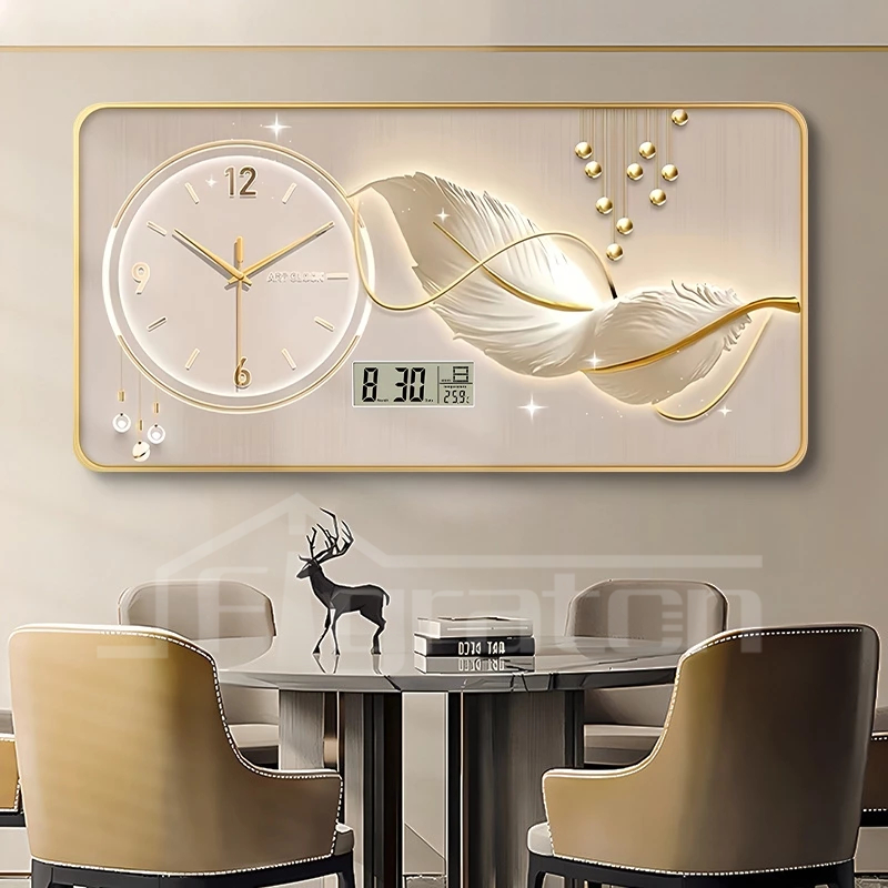 Jam Dinding Ruang makan Mewah Bentuk Bulu Jam Hiasan Dinding Aesthetic 100x50cm Ruang Tamu Lukisan Krystal Porselin Wall