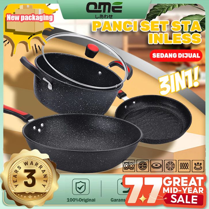 QME Antilengket Peralatan Masak 3PCS Peralatan Dapur Cocok Untuk Semua Kompor Wajan Panci Paket Keluarga Set