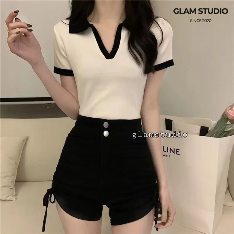 Glamstudio - Kaos Crop Wanita Kerah V Crop Top V neck Raglan Kekinian (S, M, L, XL)