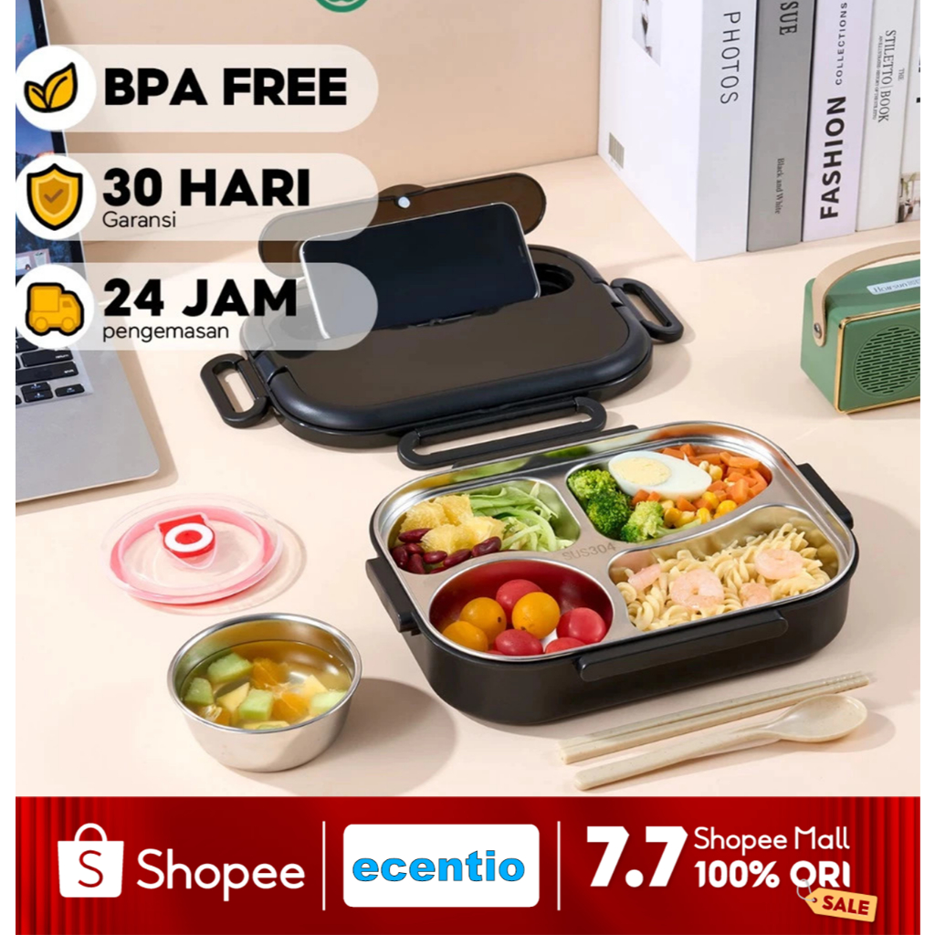 ECENTIO KOTAK MAKAN 4 GRID 1000ML 304 STAINLESS STEEL LUNCH BOX TEMPAT SENDOK WADAH BEKAL ANTI TUMPAH SUP GARPU ANAK FIT