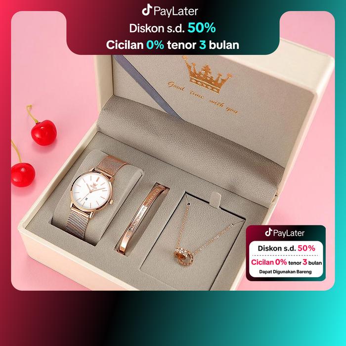 OLEVS Jam Tangan Wanita Set Kalung Gelang Original Asli Untuk Tahan Air Rose Gold Lady Girl Watch