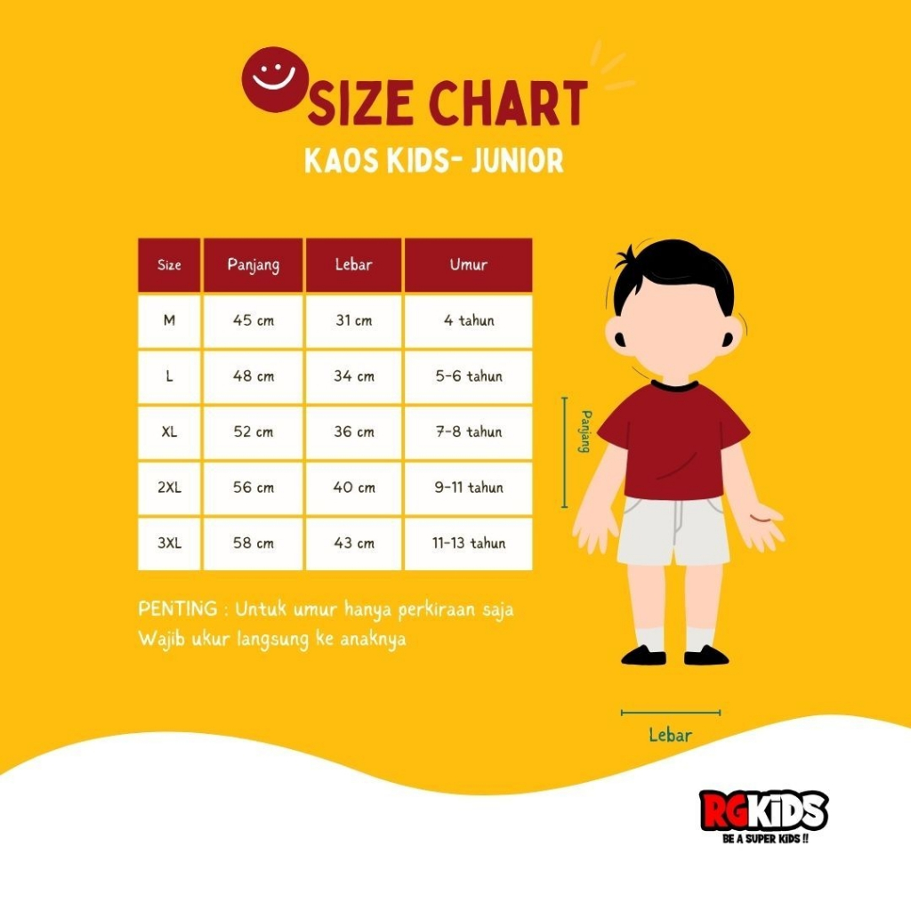 M (4 tahun), L (5-6 tahun), XL (7-8 tahun), 2XL (9-11 tahun), 3XL (11-12 tahun)