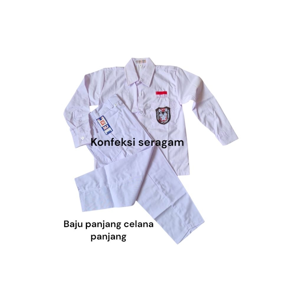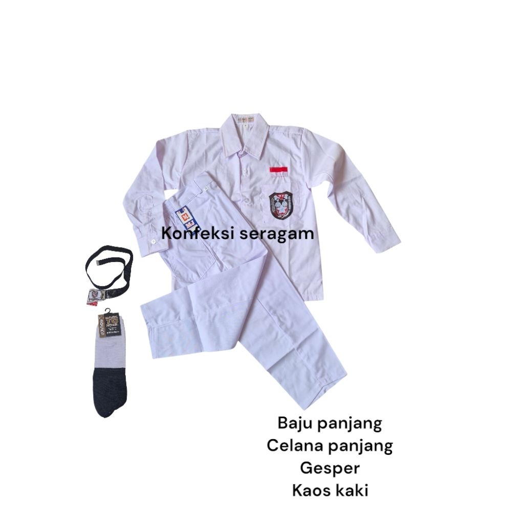 SERAGAM SD/MI SET LENGKAP LAKI LAKI KEMEJA PANJANG, CELANA PUTIH PANJANG, GESPER, DAN KAOS KAKI