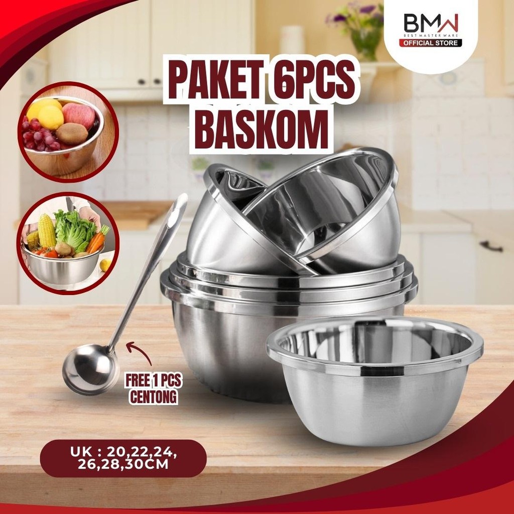 KITCHENWARE PAKET 6 PCS BASKOM PREMIUM SUS 304 PENCUCI SAYUR BAHAN STAINLESS STEEL TEBAL FREE CENTONG SAYUR STAINLESS WADAH PENCUCI BUAH SAYUR BASKOM BERKUALITAS