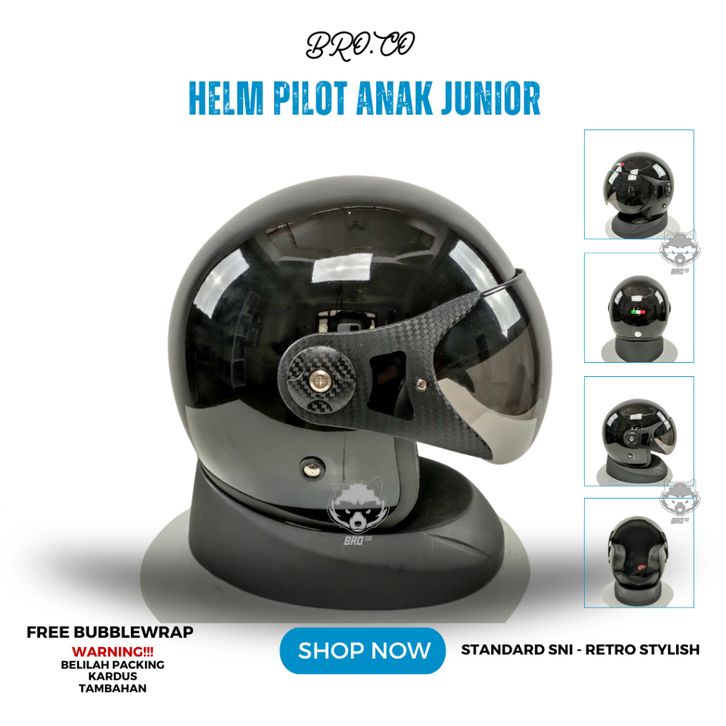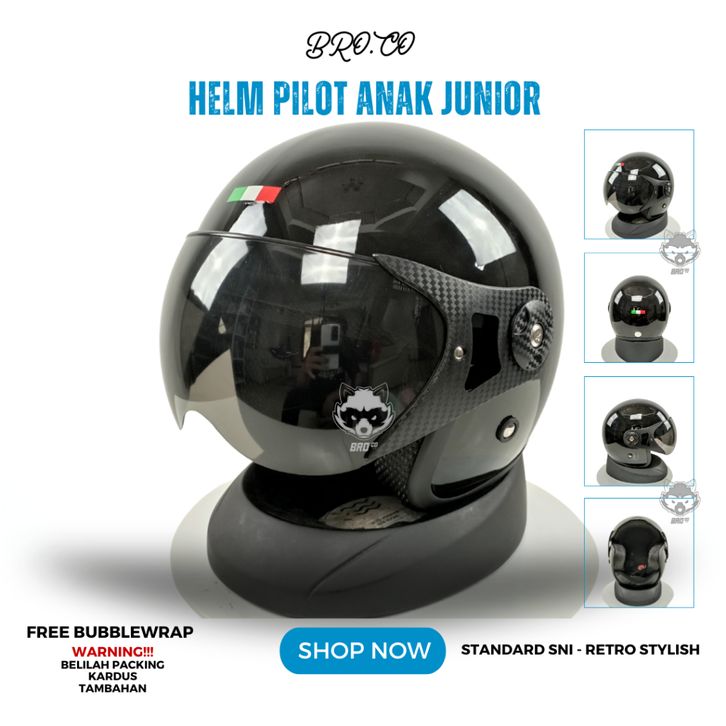 TERLAKU HELM PILOT RETRO ITALY ANAK ANAK JUNIOR HALF FACE HITAM BLACK GLOSSY STANDARD SNI PREMIUM BROKIDS BRO.CO