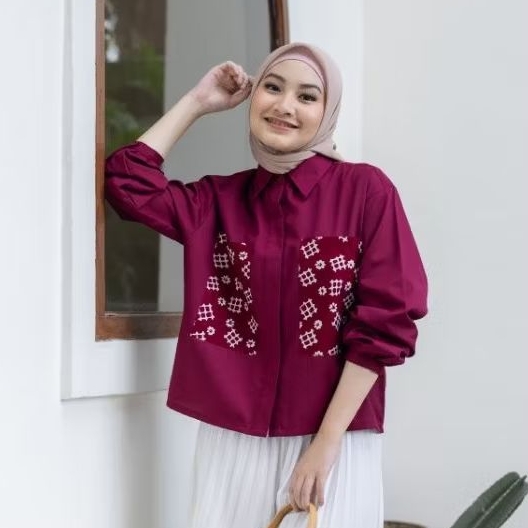 Amarestola - Dayna Batik Crop Maroon / Kemeja Batik Wanita / Batik Wanita Modern