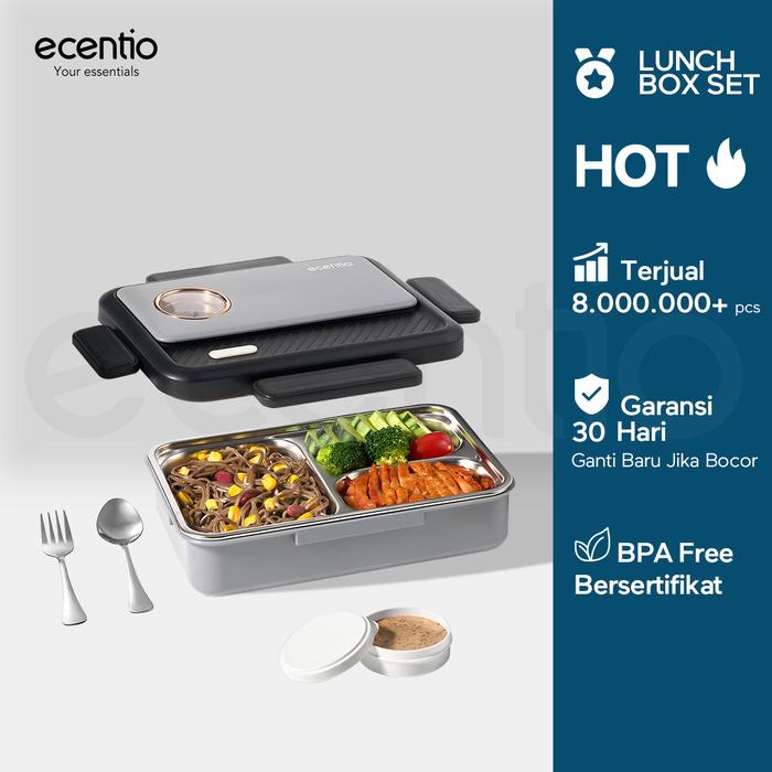 ecentio tempat makan stainless 3 sekat 950ml Kotak Bekal lunch box tahan panas anti bocor hitam abu