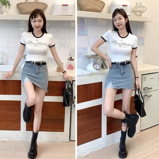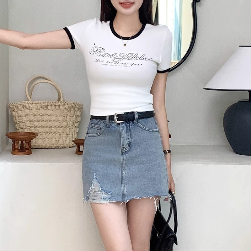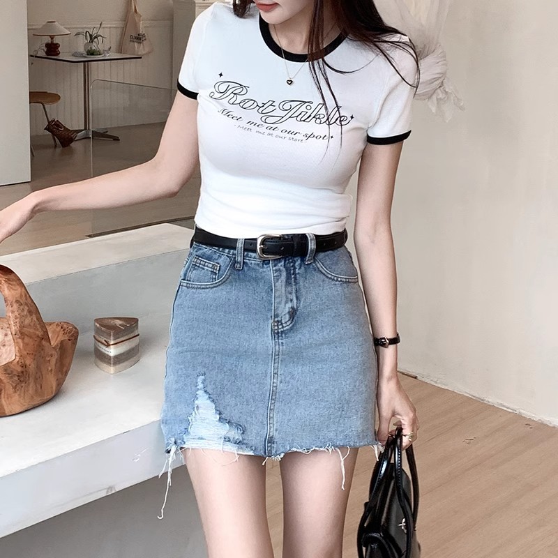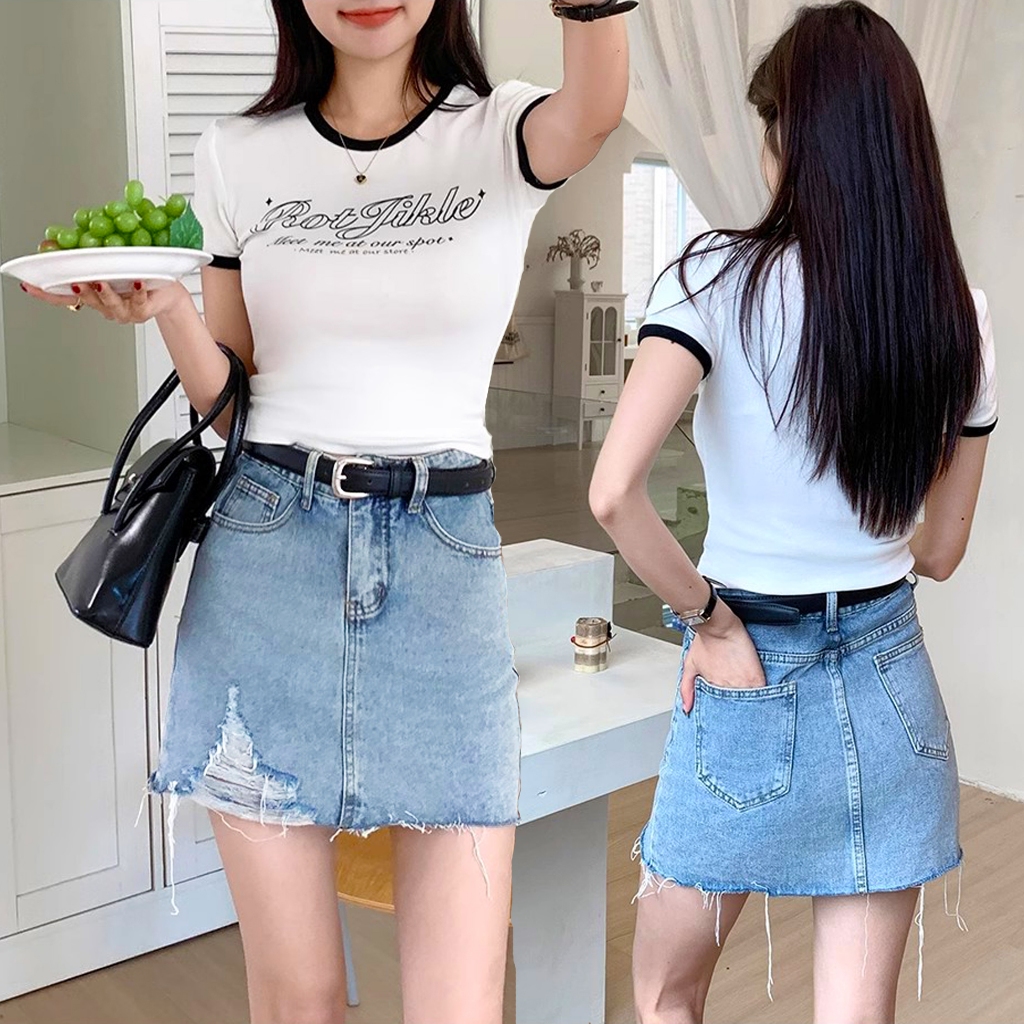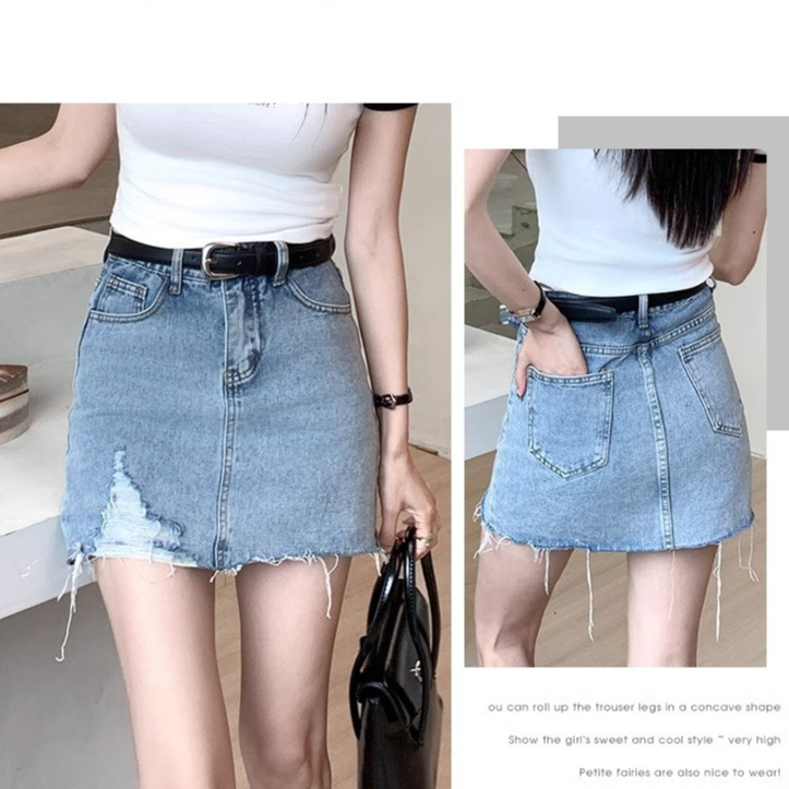 Rok Jeans Wanita Rok Pendek Highwaist Jumbo Sobek Ripped a-Line Korean Style