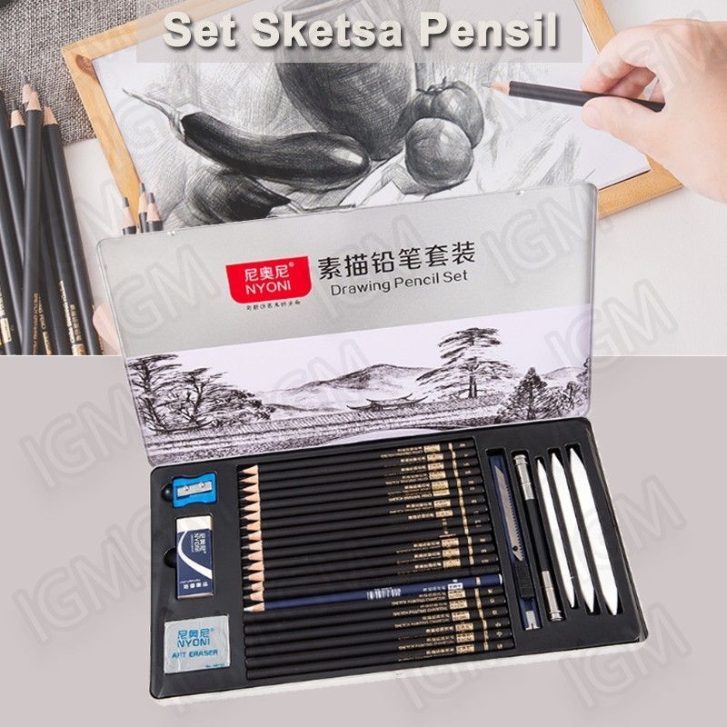 Set 29pcs Lukis Sketsa Lengkap Paket Drawing Pencil Gambar Metal Tin Box Pensil Gambar