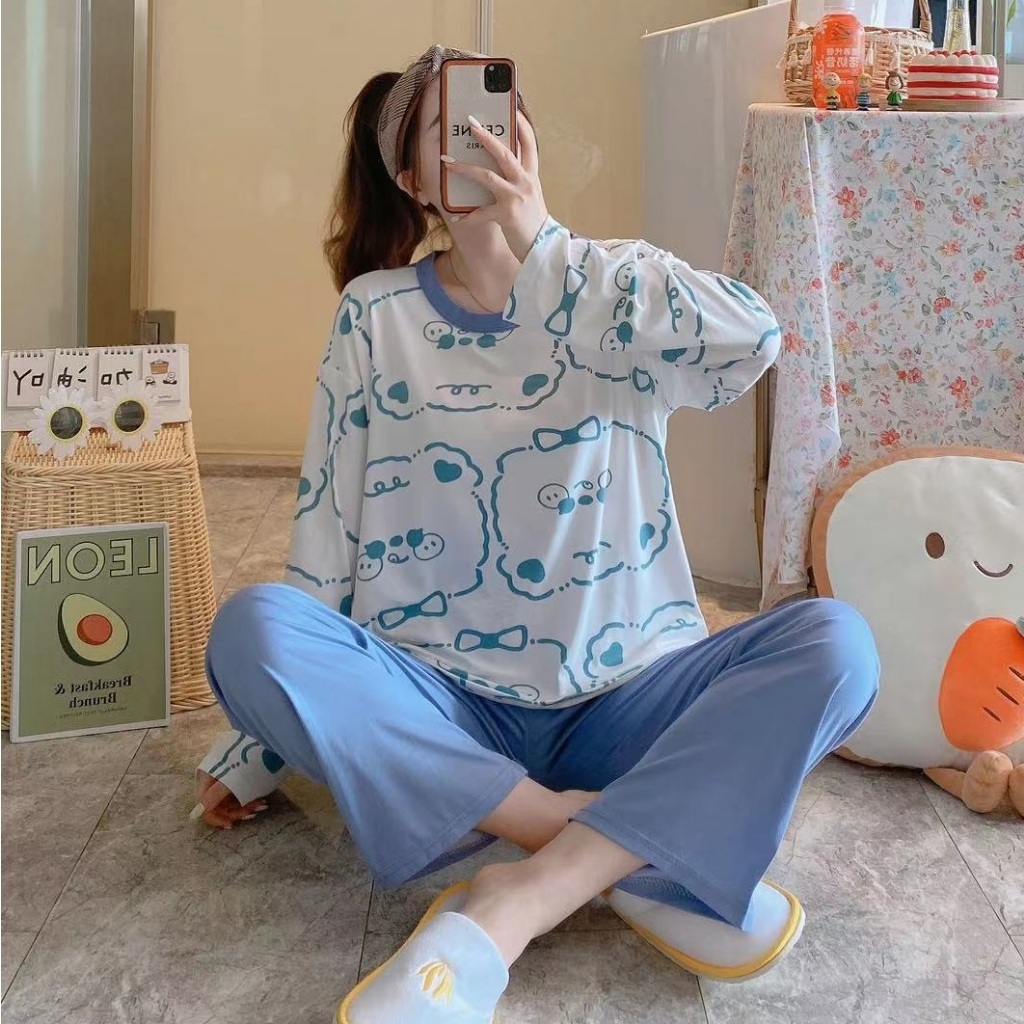 Yooyi Baju Tidur Wanita Set Dewasa Bahan Katun Adem Lengan Panjang Celana Panjang Piyama Setelan Perempuan Remaja Oversi