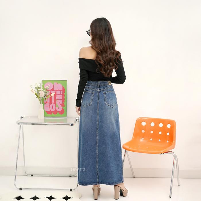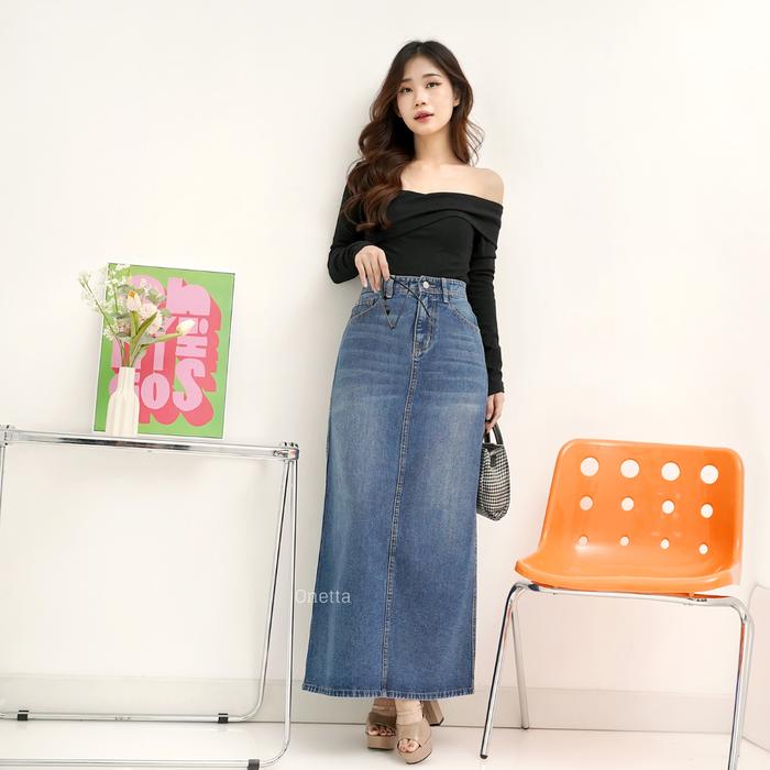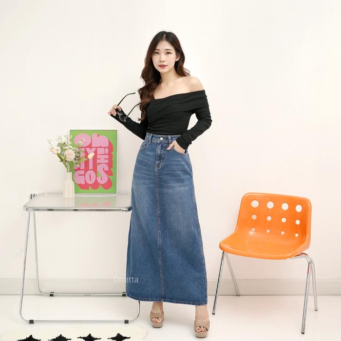 Onetta - OLIVIA (Dark Blue Scrub) - Rok Jeans Panjang Berhijab Tebal Basic High Waist Wanita