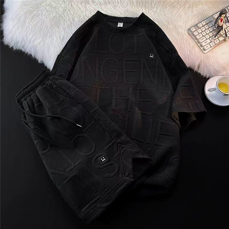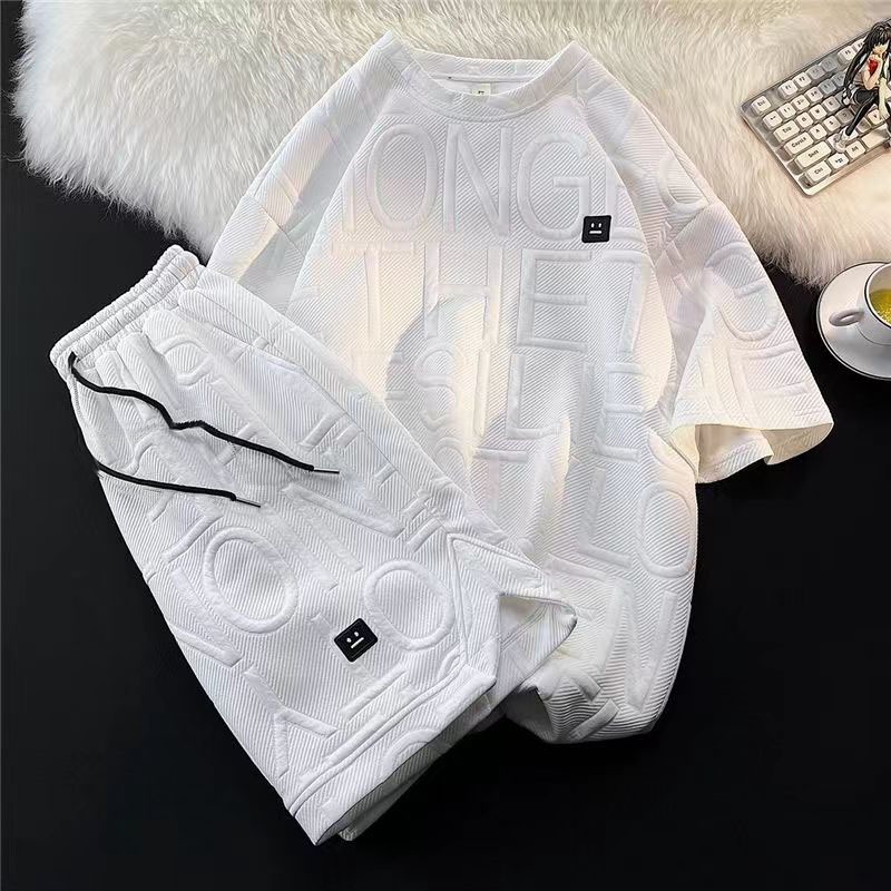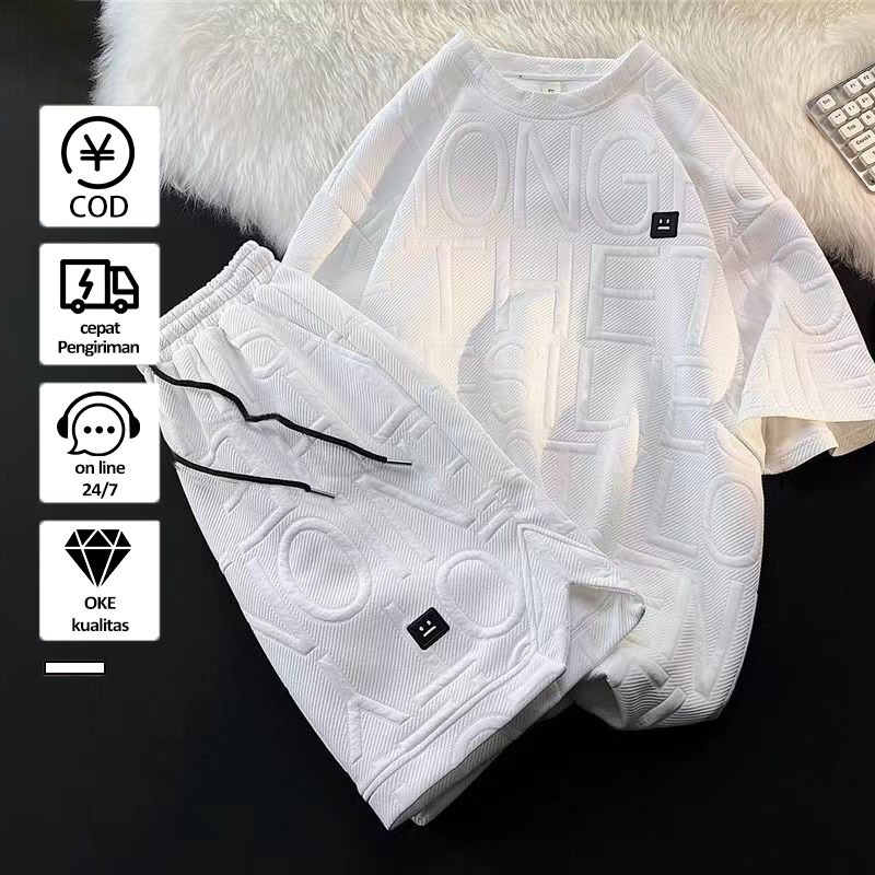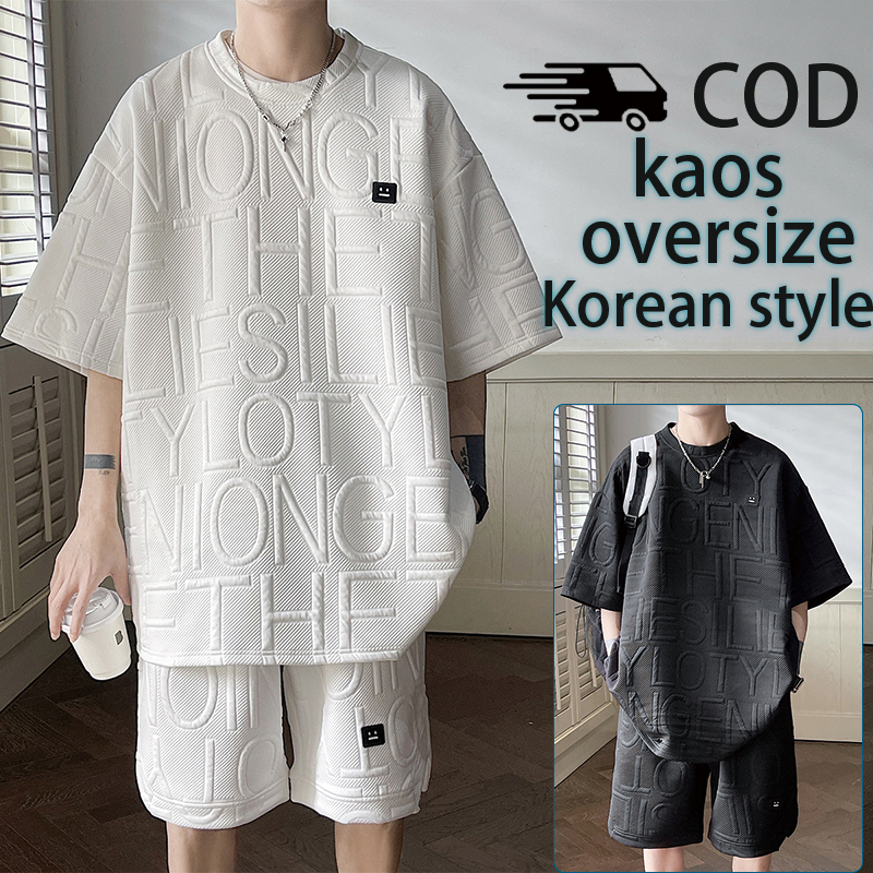 KeyBoy satu set pakaian pria polos leher bulat+celana pendek loose kasual sport setelan kaos pria korean style