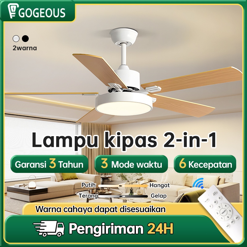Gogeous lampu kipas angin gantung plafon Dekorasi retro Nordik lampu kipas angin remote 3 warna 5 daun Ruang tamu/kamar
