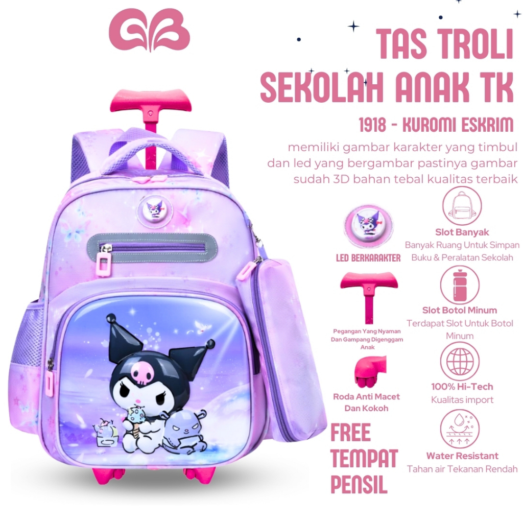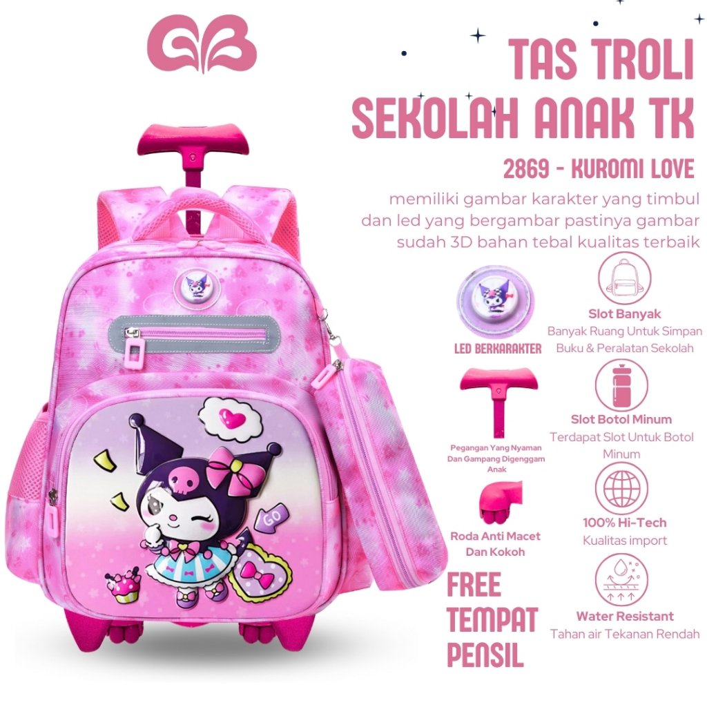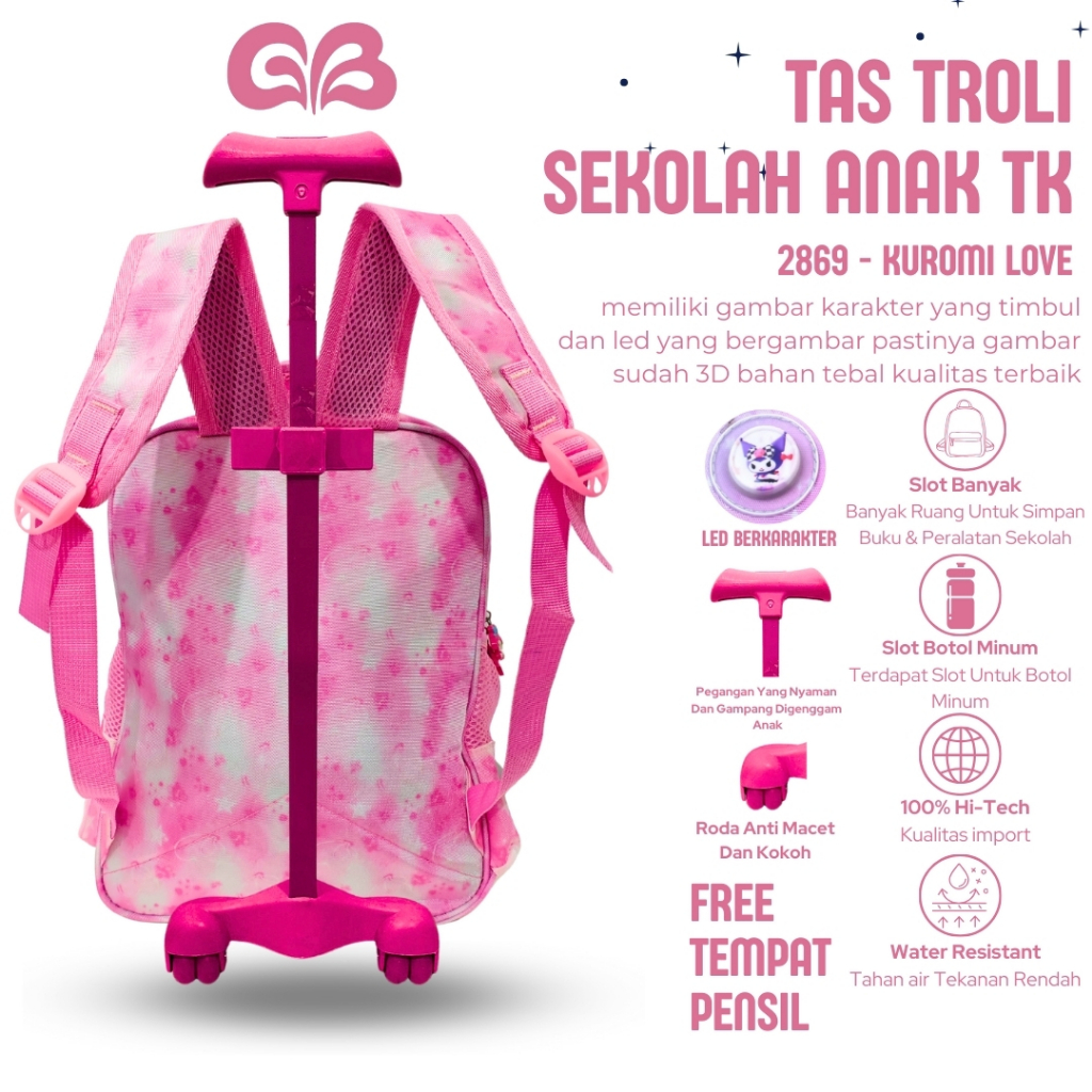 Geulis Bags Tas Troli Sekolah Anak TK Perempuan Troly Ransel Dorong Karakter Kuromi Anti Air 2869