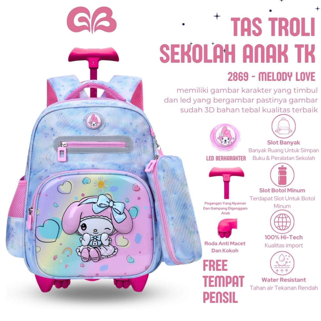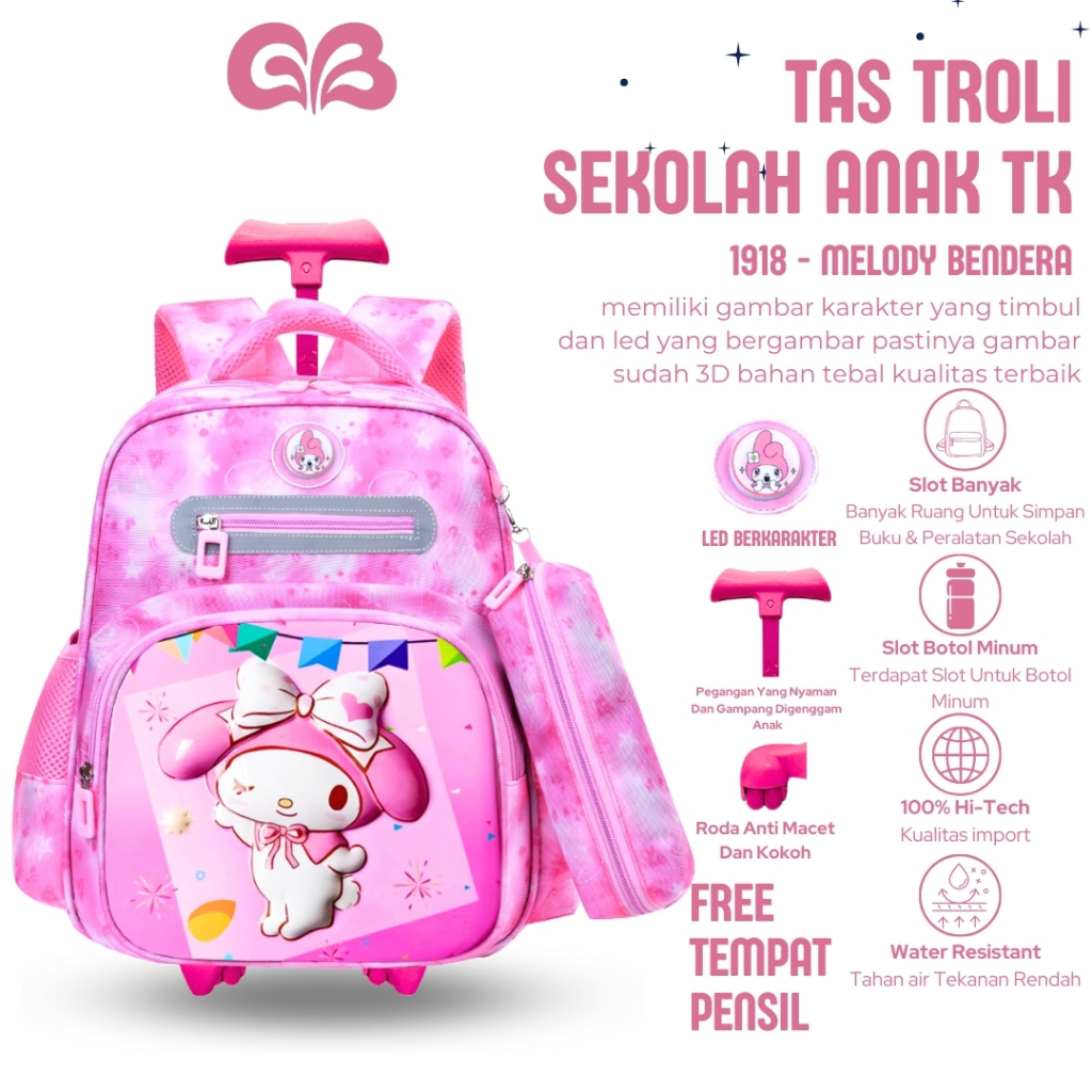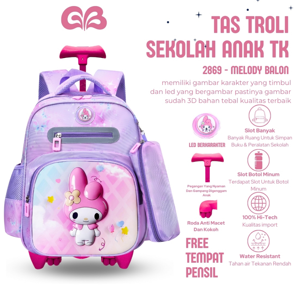 Geulis Bags Tas Troli Sekolah Anak TK Perempuan Troly Ransel Dorong Karakter Kuromi Anti Air 2869