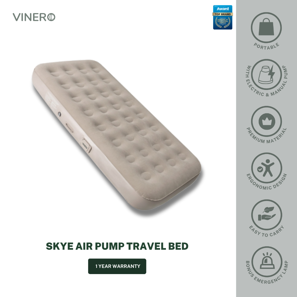 VINERO SKYE PORTABLE TRAVELLING BED AIR INFLATION PUMP INFLATABLE CAMPING MATTRESS EMERGENCY LIGHT