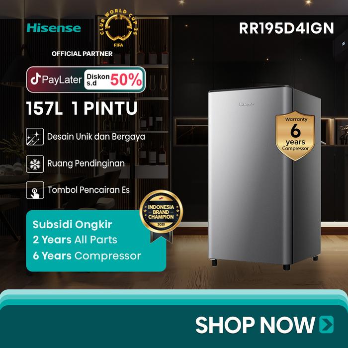 Hisense-Rr195D4Ign-Kulkas 157L -Kapasitas 1 Pintu -Desain Unik Dan Bergaya-Ruang Pendinginan-Tombol Pencairan Es- Separa