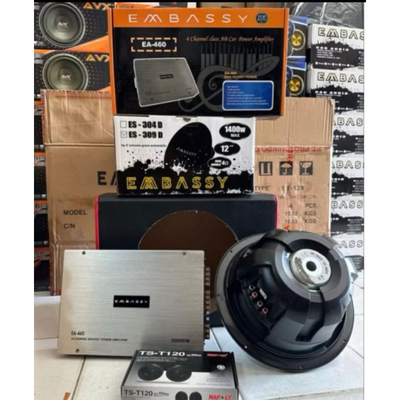 Paket Sound Audio Mobil 12inch EMBASSY(Power embassy EA-460.4..Subwoofer Embassy ES-309D..Box 12in + Twiter TS