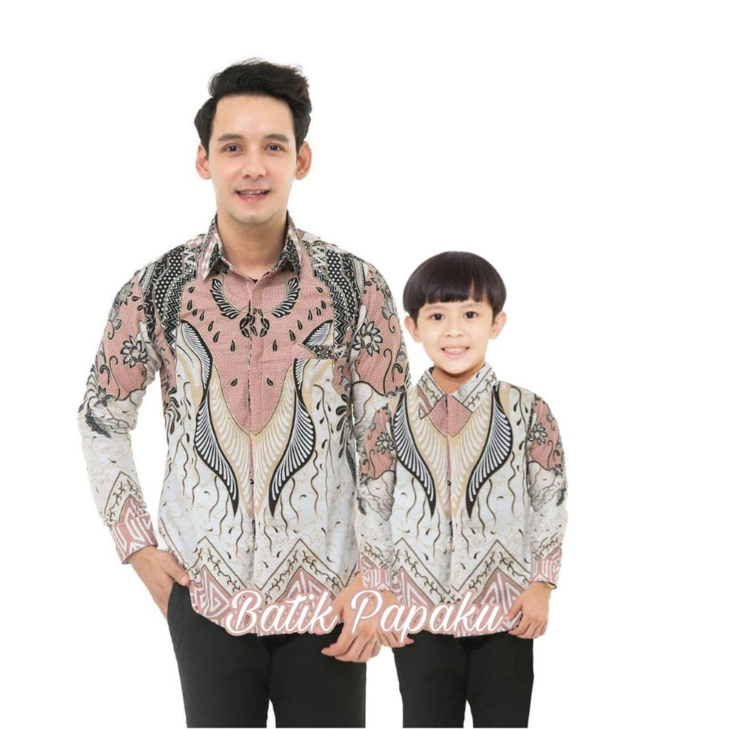 Kemeja Batik Anak Laki-Laki Lengan Panjang Batik Ayah dan Anak Cowok warna Peach Pink Salem Kombinasi Putih Motif Laskar