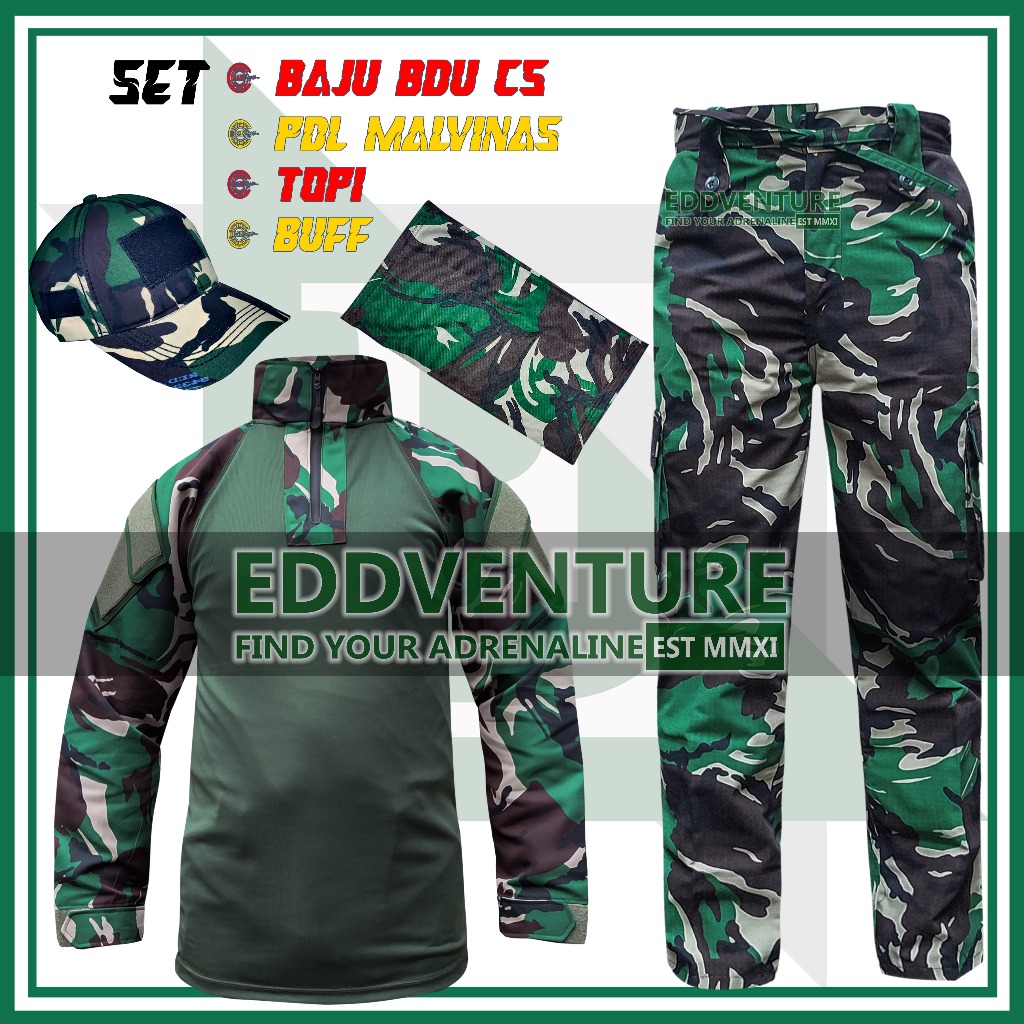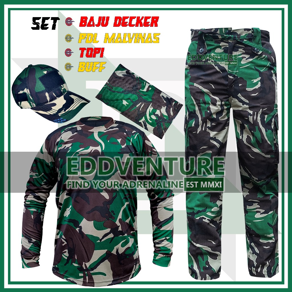 Full Set Setelan Pakaian Seragam Kaos Baju Decker BDU CS Celana Panjang Topi Buff Loreng Malvinas Tactical Outdoor TNI AD AL AU Lengan Panjang Pendek Tentara Army Dinas Pria Wanita Dewasa