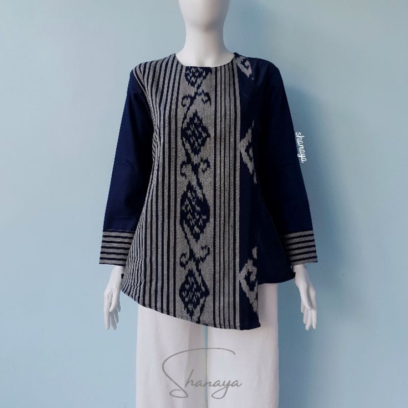 Shanaya Batik Blus Tenun Troso Ori Kombi Toyobo Warna Navy Blouse Batik Kerja Cantik