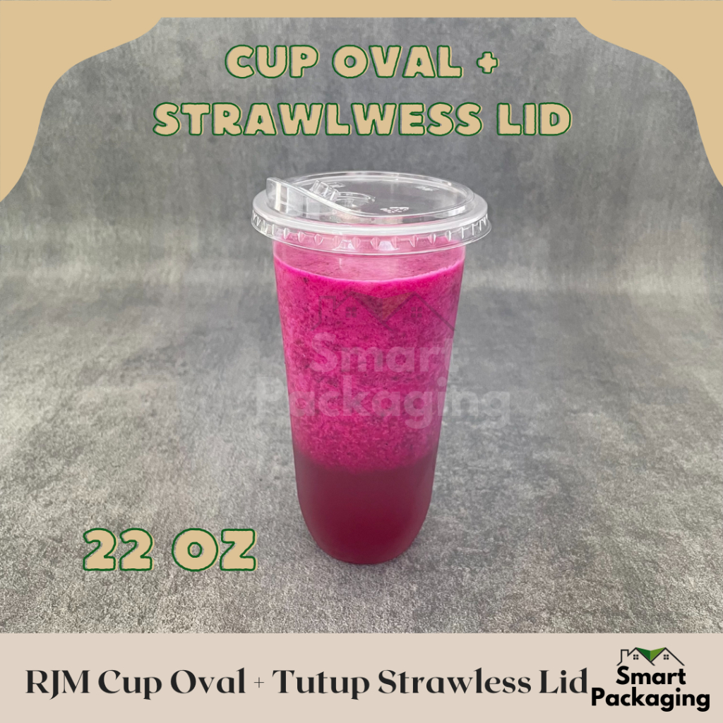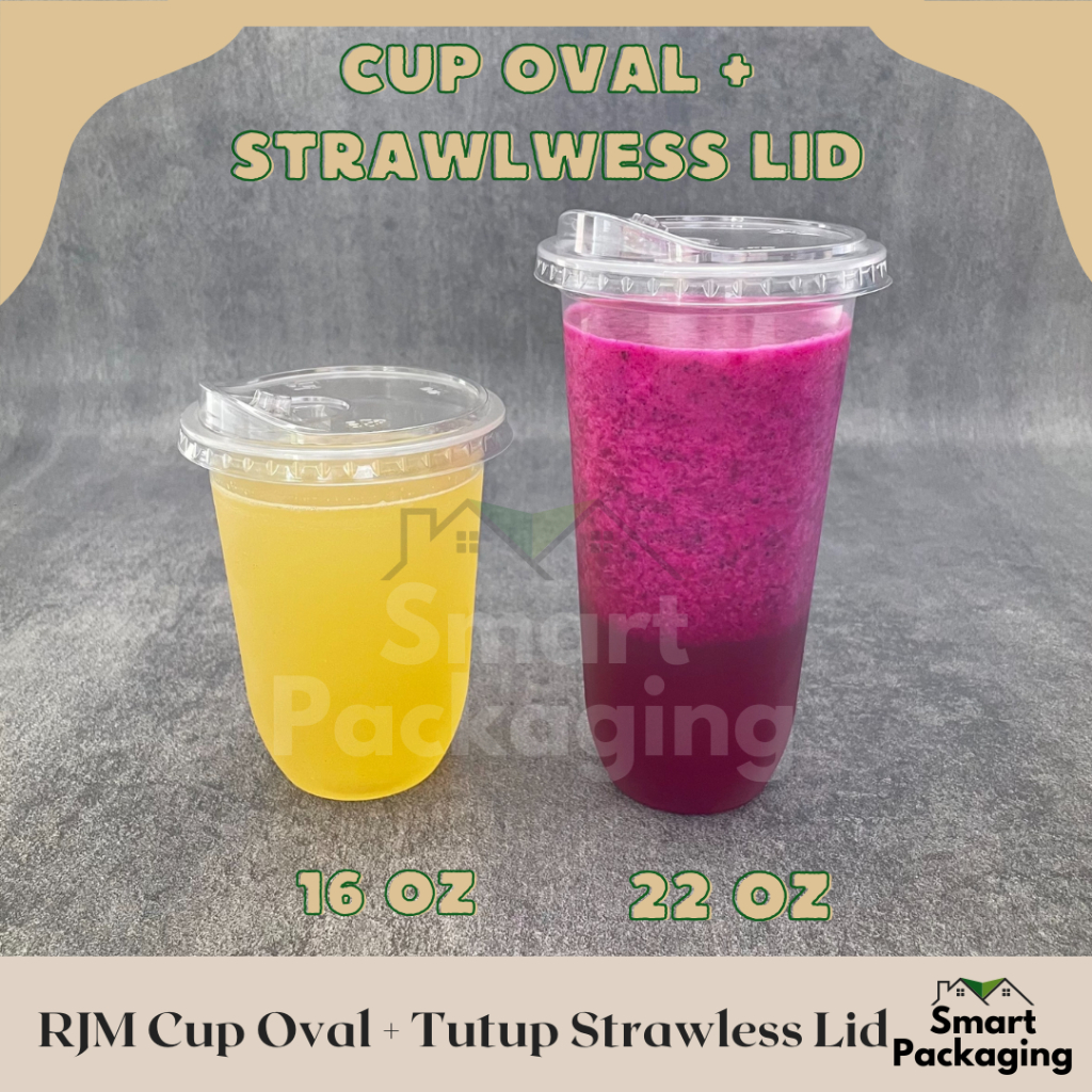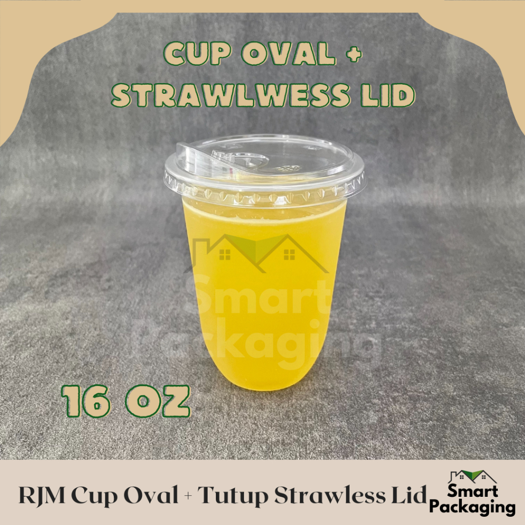 [ISI 50 PCS] RJM GELAS PLASTIK OVAL PP 16 OZ 22 OZ 7GR + STRAWLESS LID RJM IMP / CUP PLASTIK DATAR + TUTUP SEKALI PAKAI
