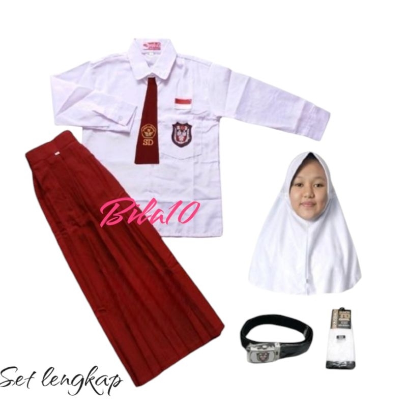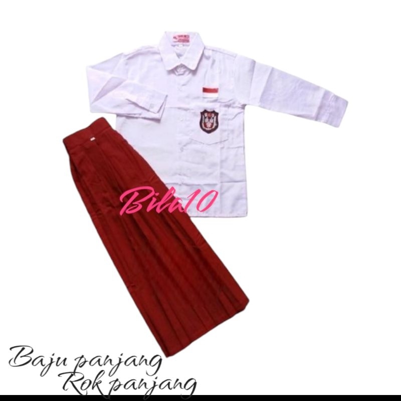 Set Lengkap Baju Putih Panjang Rok Merah Panjang SD Anak Perempuan