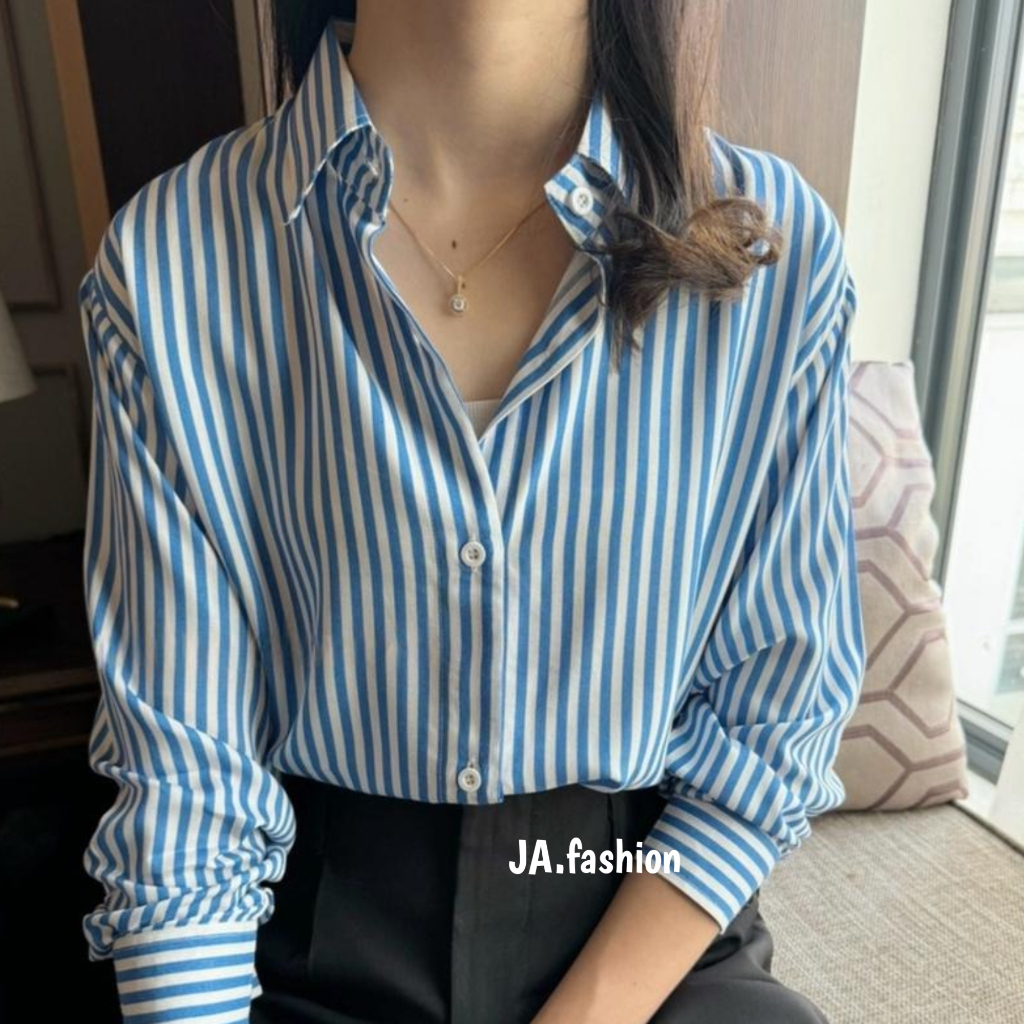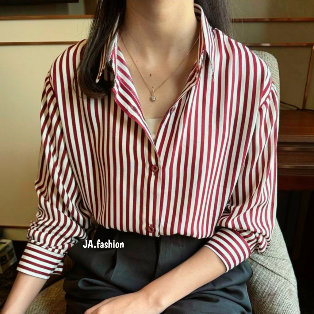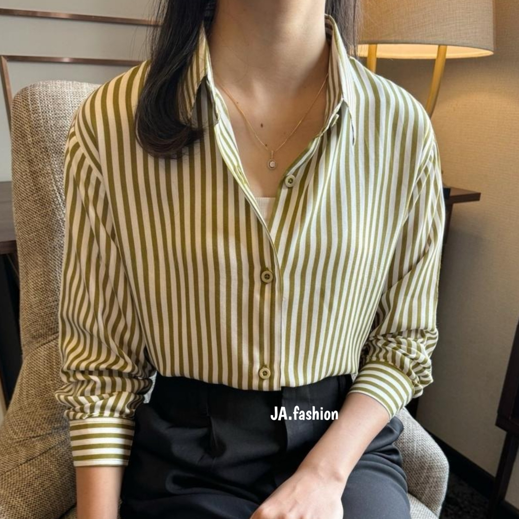Kemeja Formal Wanita Stripe Shirt Motif Salur Garis Rayon Premium M L XL XXL Terlaris By JA Fashion