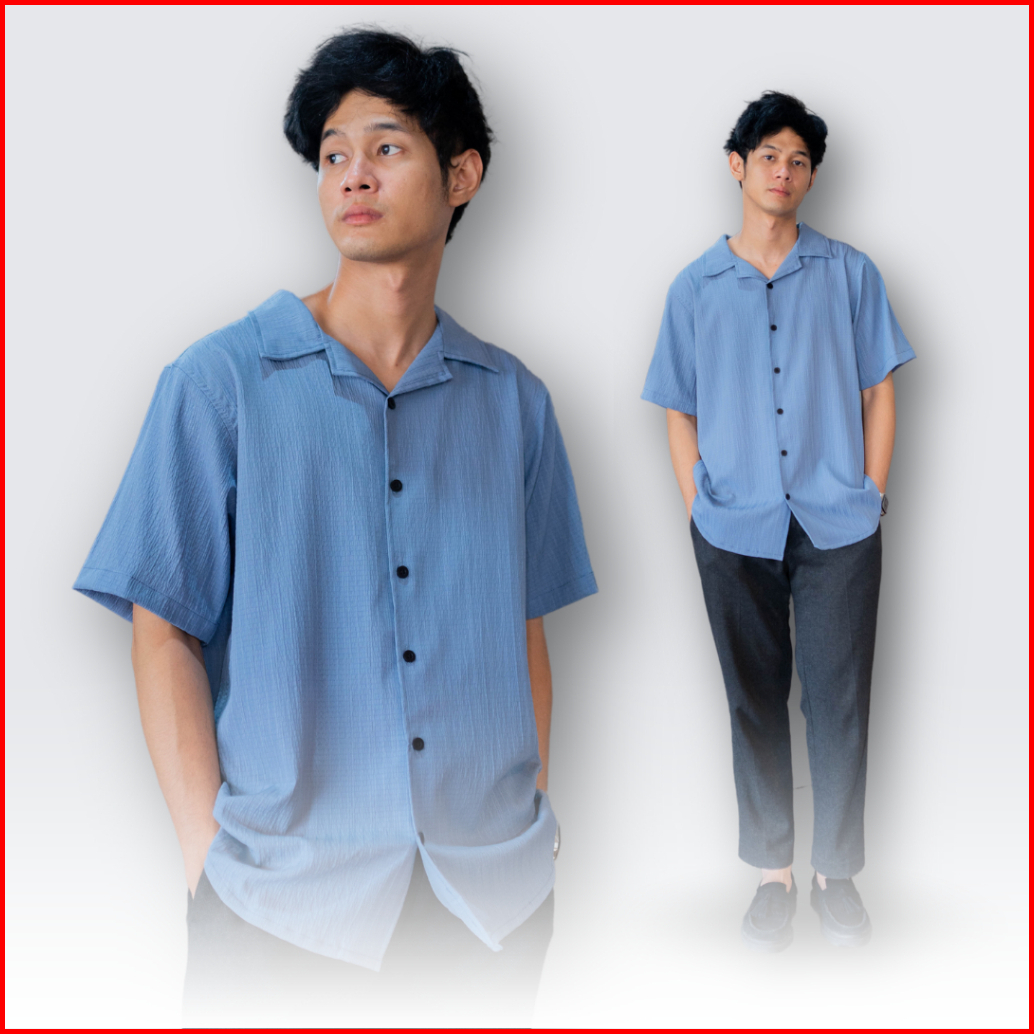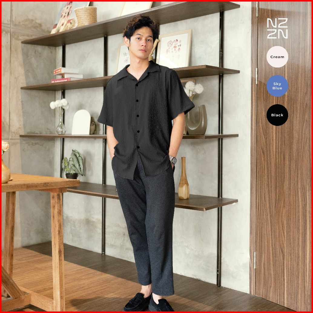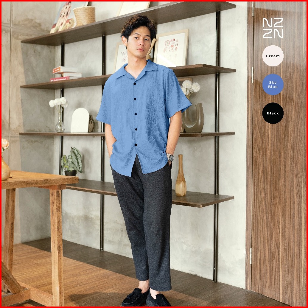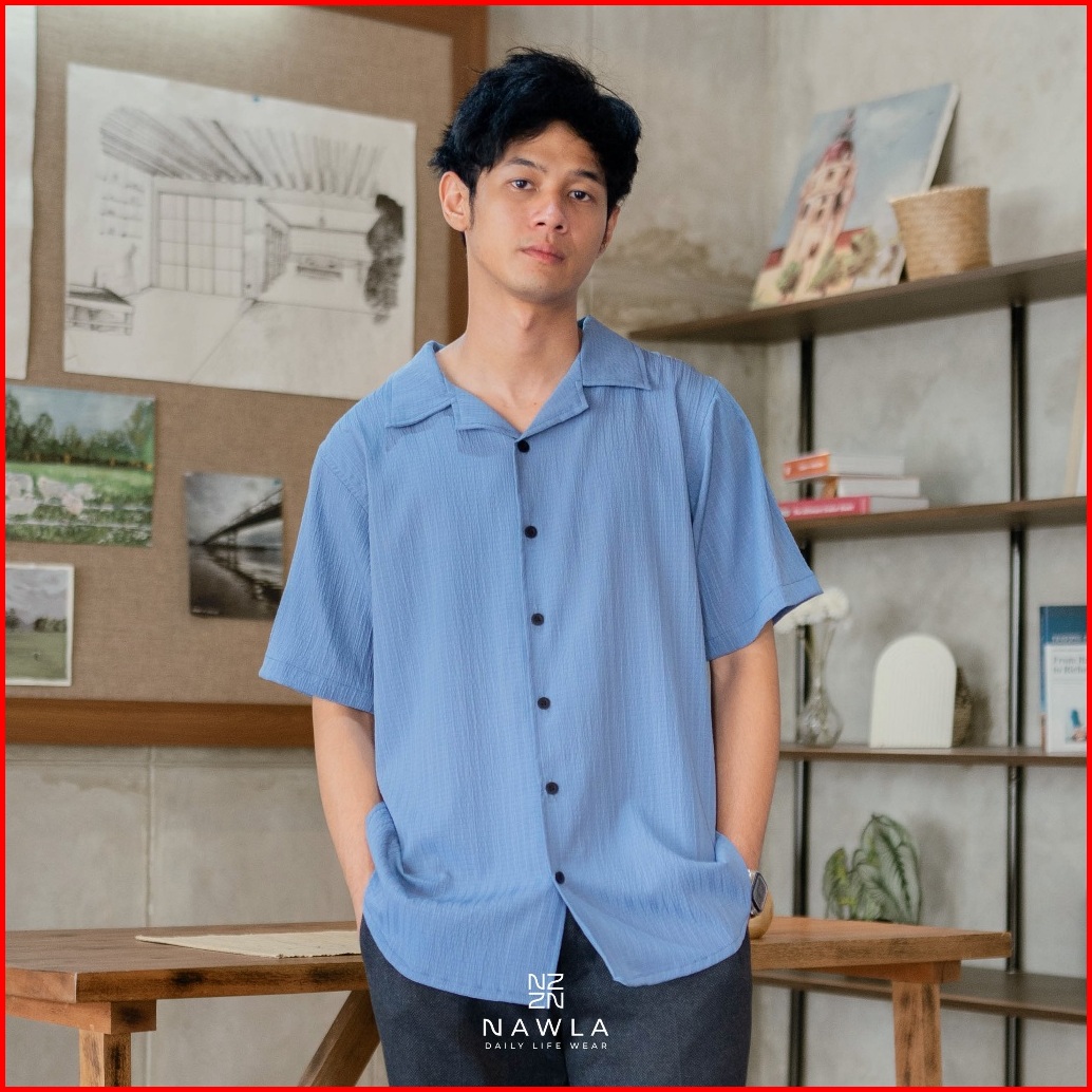 Nawla - Baju Atasan Kemeja Kerah Cuban Bahan Crinkle Laki-laki Lengan Pendek